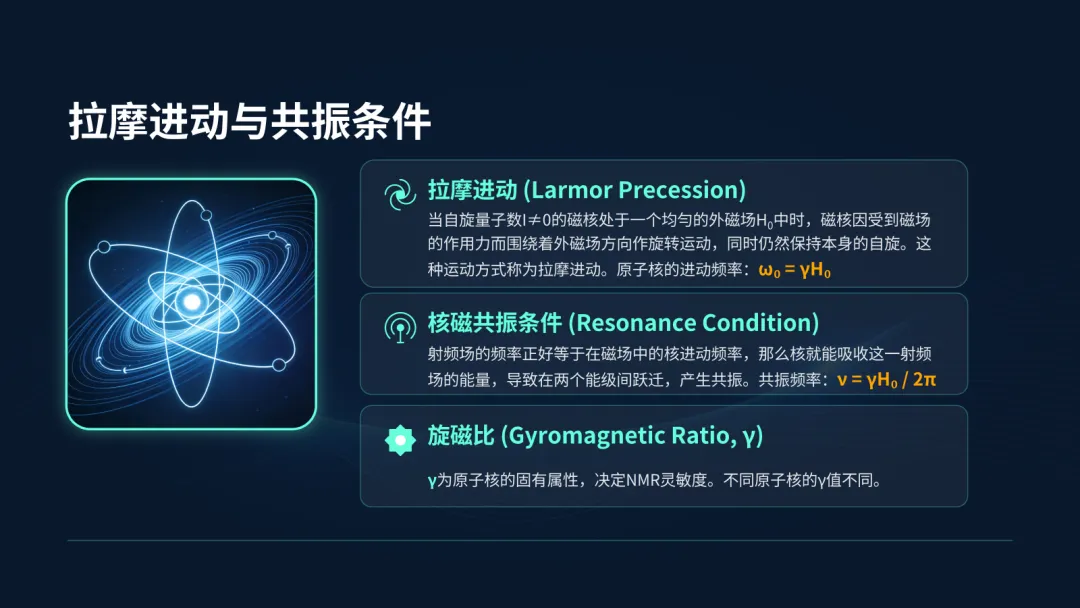 进动的频率取决于原子核本身的旋磁比和外磁场的强度。当我们施加一个射频场,其频率恰好等于原子核的进动频率时,就会发生共振,原子核吸收能量,产生我们能检测到的NMR信号。