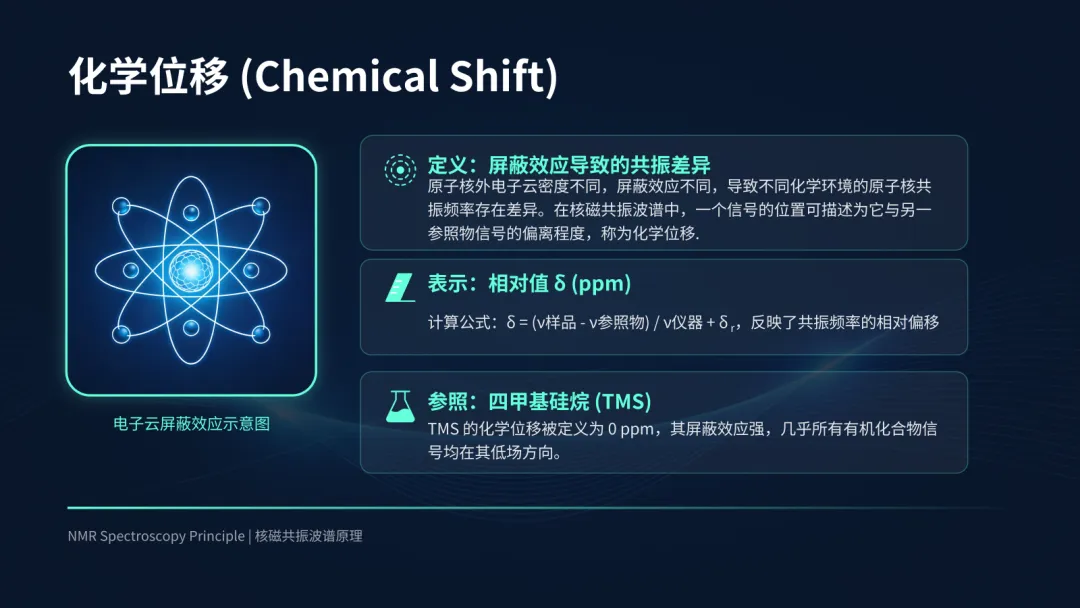 分子中不同位置的原子核,其周围的电子云密度不同,对原子核的屏蔽作用也不同。