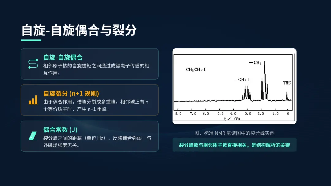 简单来说,一个氢核会受到相邻碳上氢核自旋的影响,导致其信号峰分裂成多个小峰,这就是裂分。裂分的峰数遵循n+1规则,其中n是相邻的等价质子数。裂分峰之间的距离称为偶合常数J,它是结构解析的重要依据。