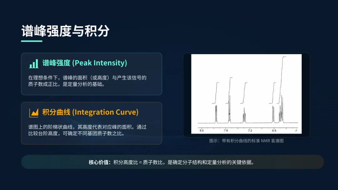 谱峰的面积直接对应于产生该信号的质子数。在谱图上,我们通常会看到一条阶梯状的积分曲线,每一个台阶的高度就代表了对应峰的面积。通过测量这些台阶的高度比,我们可以准确地知道分子中不同部分的氢原子数量比例,这对于确定分子结构和进行定量分析都至关重要。