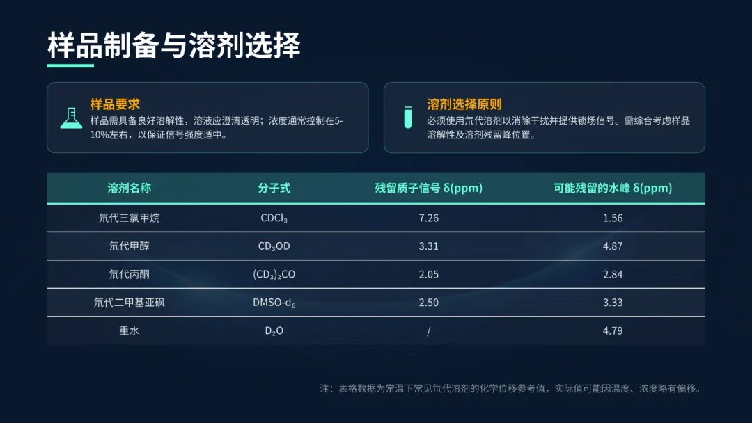 样品制备的第一步是选择合适的氘代溶剂。氘代溶剂中的氢被氘取代,不会产生干扰信号,同时还能帮助仪器稳定磁场。