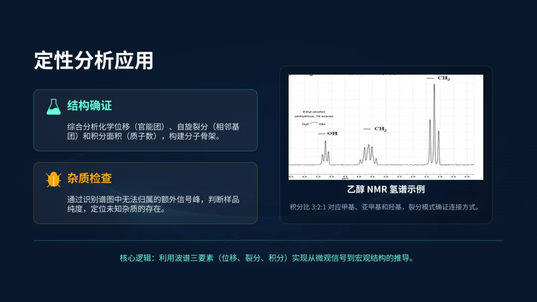 如乙醇氢谱图,我们可以清晰地看到三个不同的信号峰,通过分析它们的积分比(3:2:1)和裂分模式(三重峰、四重峰、单峰),可以准确地确认这就是乙醇的结构,分别对应甲基、亚甲基和羟基上的氢。