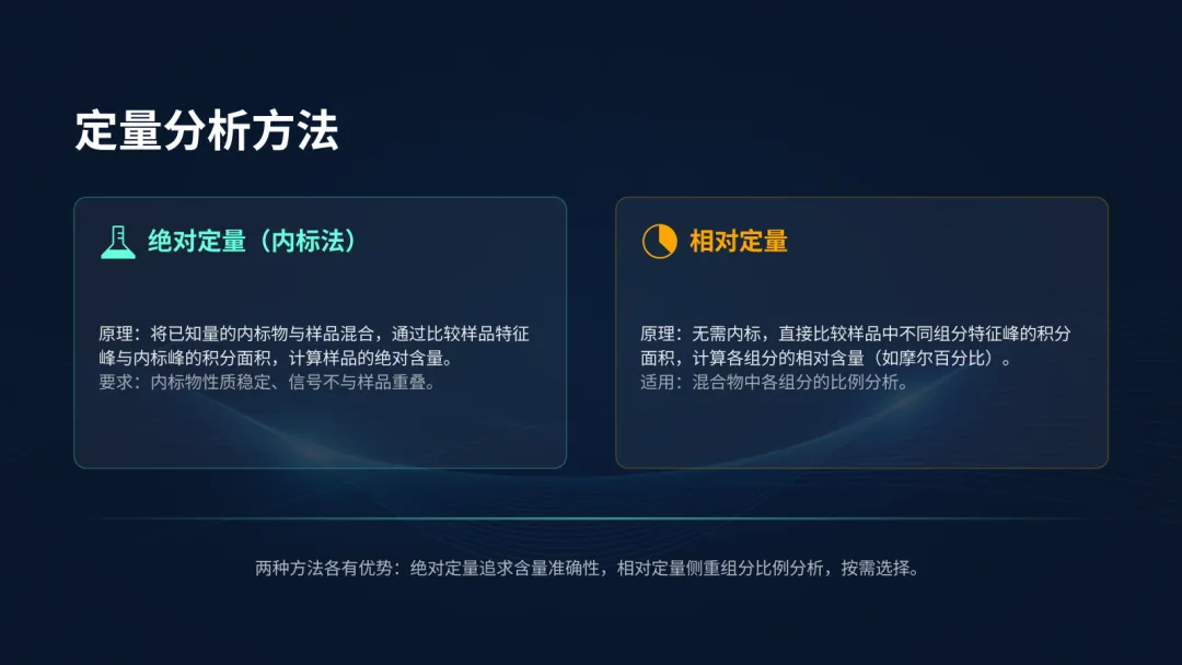 而相对定量法则更简单,不需要内标,直接比较样品中不同组分的信号强度,就能得出它们之间的比例关系。这两种方法各有优势,适用于不同的分析需求。
