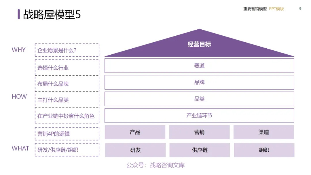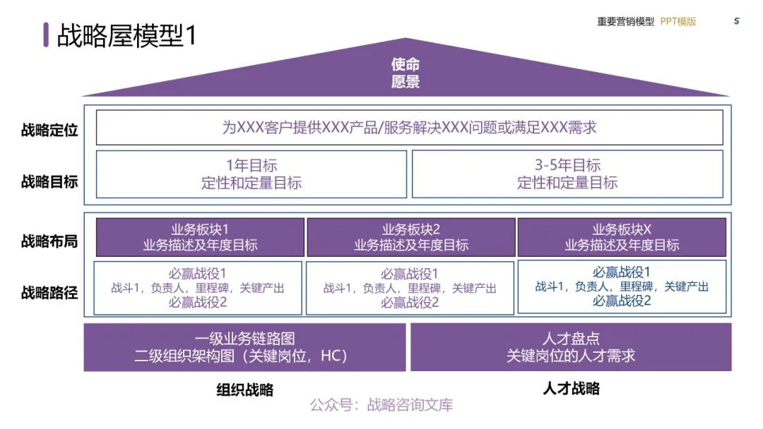 在日益复杂的商业环境中,企业亟需系统化、结构化的思维工具来应对挑战、把握机遇。战略模型通过将复杂问题模块化,为企业提供了清晰的行动路线图。以下五大专业“战略屋”模型,分别从不同维度构建了企业战略体系,共同构成了企业从顶层设计到落地执行的完整作战沙盘。