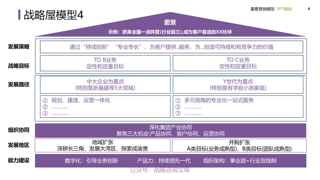 1. 麦肯锡战略屋:战略规划的经典范式作为战略规划的基石,麦肯锡战略屋以其极简却深刻的逻辑框架闻名。屋顶是引领性的“战略愿景”,墙体由相辅相成的“关键举措”支撑,地基则是具体的“行动计划与绩效指标”。这个模型的核心价值在于其强大的逻辑自洽性——它要求各要素间必须形成严密的因果链条,确保“想做、能做、该做”的高度统一。它不仅适用于公司整体战略,更可向下穿透至业务单元,是培养管理者系统性思维的必修课。