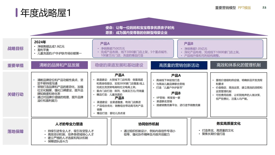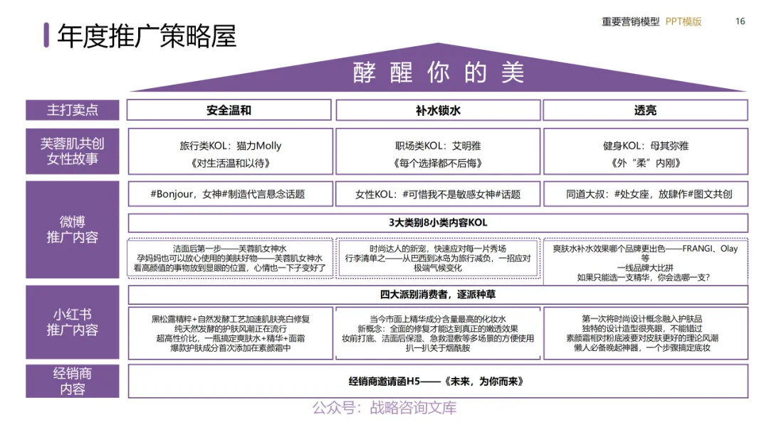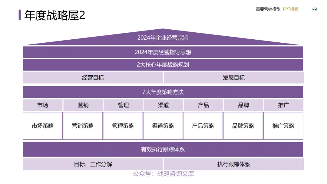 4. 渠道营销策略屋:构建协同共赢的渠道生态在渠道碎片化的今天,该模型致力于解决效率与体验的平衡问题。屋顶是渠道份额与利润目标,支撑其实现的是“渠道组合策略”与“一体化用户体验”。核心支柱则系统性地规划了“渠道布局-赋能体系-动销策略-绩效管理”四大模块。成功的渠道策略屋不仅关注“货如何流转”,更关注“如何通过渠道传递品牌价值”,最终实现线上线下的无缝融合与渠道伙伴的共赢发展。