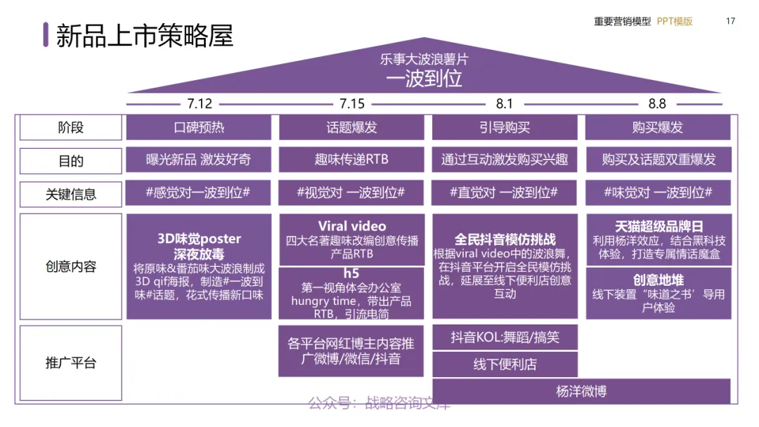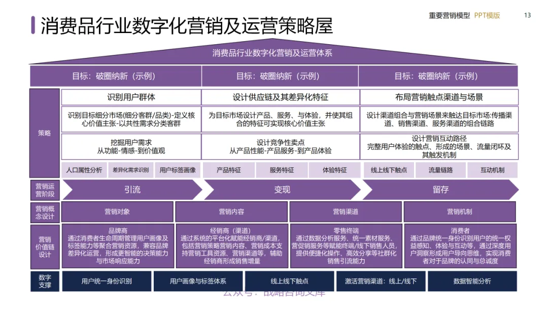 2. 消费品行业数字化营销及运营策略屋:数字时代的增长引擎在消费者主权时代,该模型重构了“人-货-场”的连接逻辑。屋顶是以“消费者为中心”的增长目标;第二层是支撑增长的“用户生命周期管理”与“数据资产沉淀”双轮驱动;核心支柱则覆盖了“流量获取-转化提升-用户留存-口碑裂变”的全链路运营。这个策略屋的精髓在于,它不再是传统的媒体投放计划,而是以数据驱动为核心,通过技术赋能实现“公域精准获客”与“私域深度运营”的完美融合,最终实现品牌资产与销售转化的双重提升。