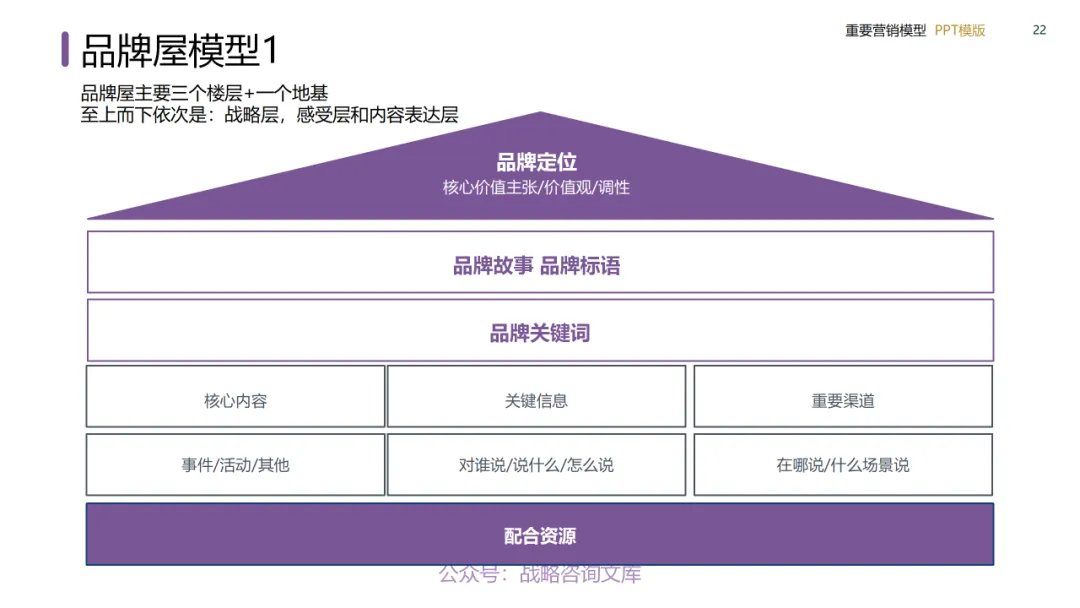 5. 品牌屋模型:奠定品牌资产的价值基石品牌屋是品牌建设的核心工具,它将抽象的“品牌心智”转化为可管理、可测量的系统工程。屋顶是品牌与消费者的“情感共鸣点”,第二层是界定市场竞争空间的“品牌定位”,核心支柱则由“功能价值-个性特质- proof points”构成坚实支撑。一个构建精良的品牌屋,能够确保产品开发、营销传播、客户服务等所有触点传递一致的声音,从而在消费者心智中建立独特而稳固的品牌形象。