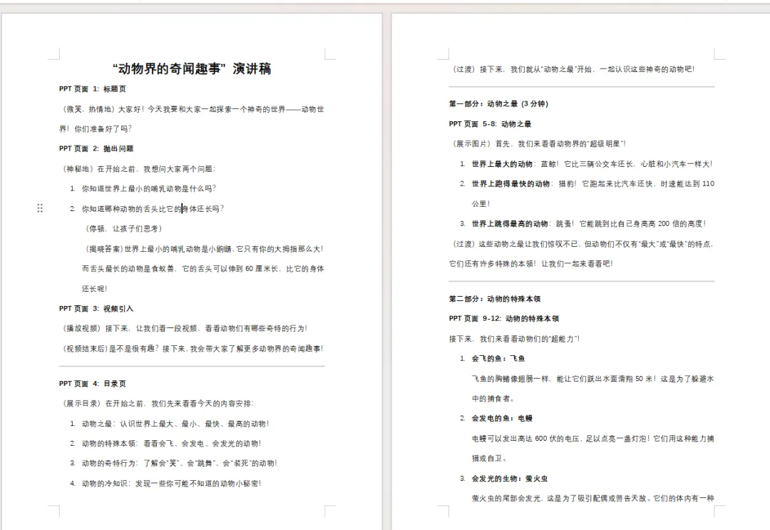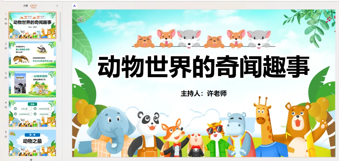 PPT页面 1: 标题页(微笑,热情地)大家好!今天我要和大家一起探索一个神奇的世界——动物世界!你们准备好了吗?