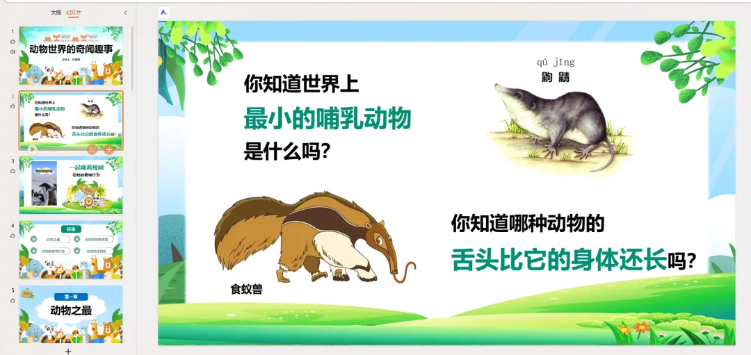 2.你知道哪种动物的舌头比它的身体还长吗?(停顿,让孩子们思考)(揭晓答案)世界上最小的哺乳动物是小鼩鼱,它只有你的大拇指那么大!而舌头最长的动物是食蚁兽,它的舌头可以伸到60厘米长,比它的身体还长呢!