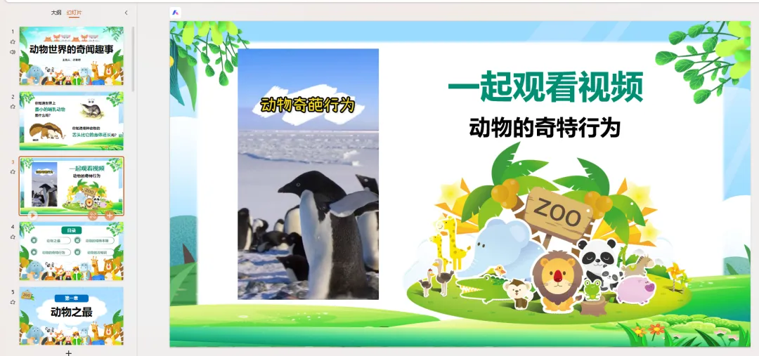 PPT页面 3: 视频引入(播放视频)接下来,让我们看一段视频,看看动物们有哪些奇特的行为!(视频结束后)是不是很有趣?接下来,我会带大家了解更多动物界的奇闻趣事!