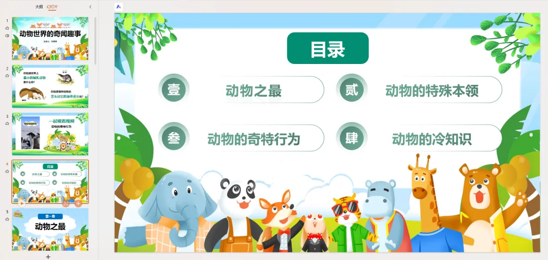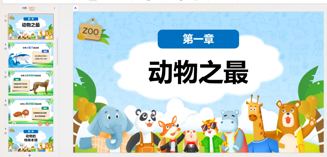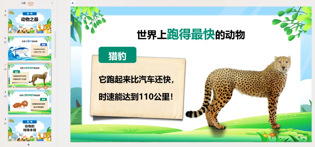 PPT页面 5-8: 动物之最(展示图片)首先,我们来看看动物界的“超级明星”!
