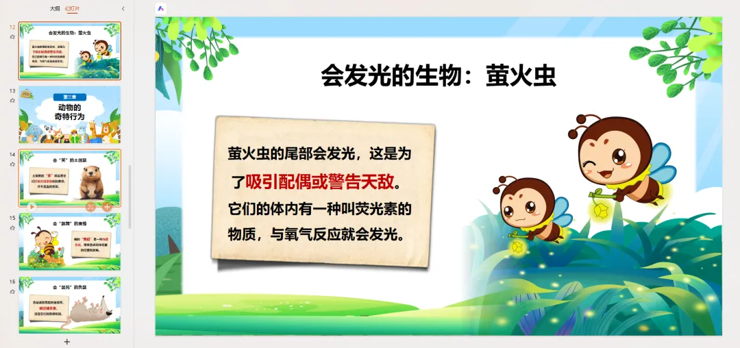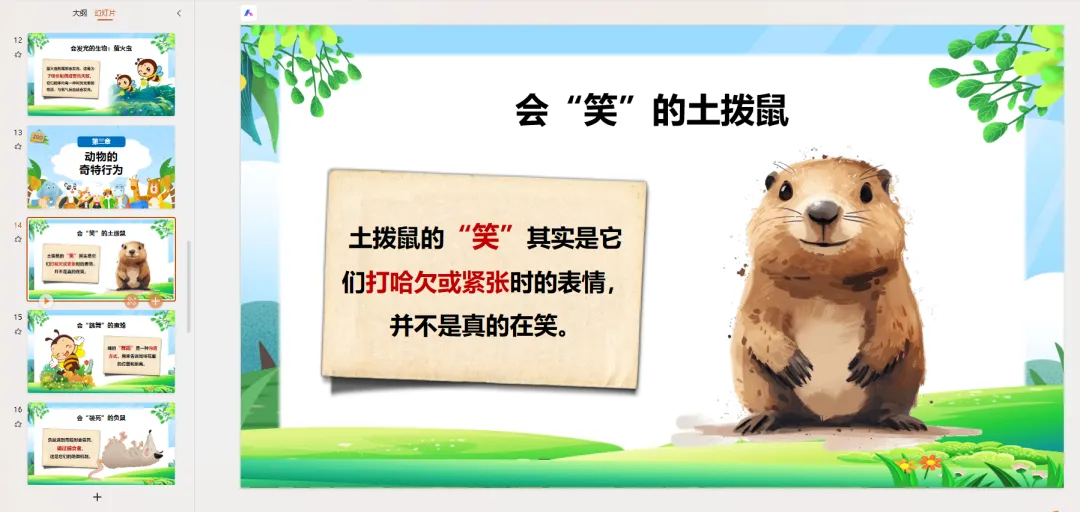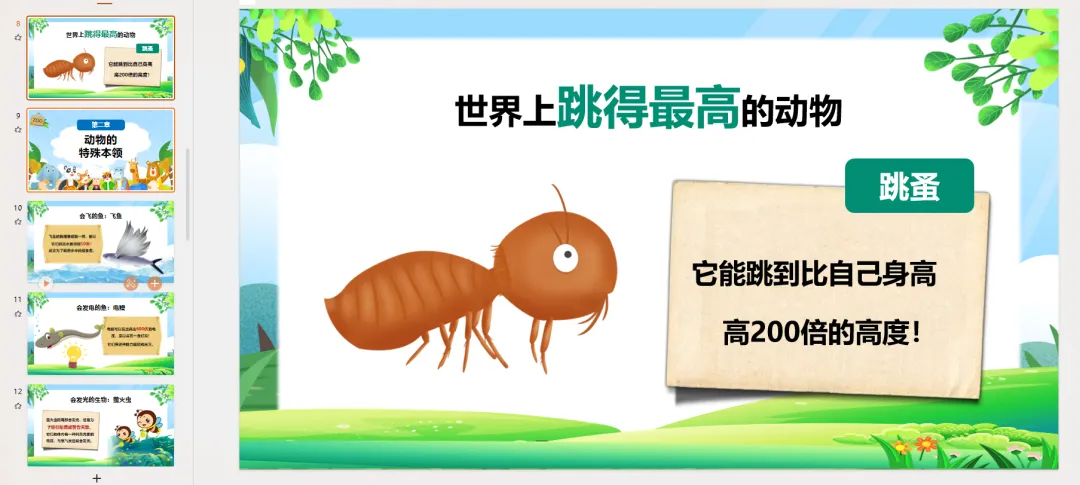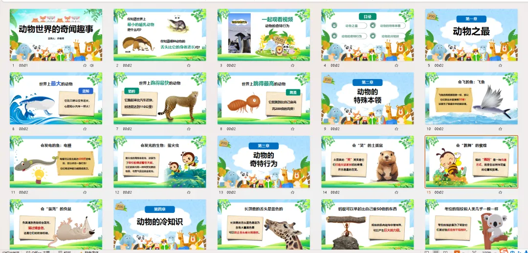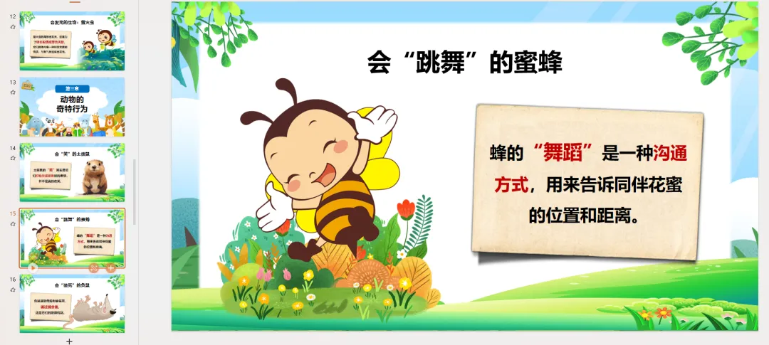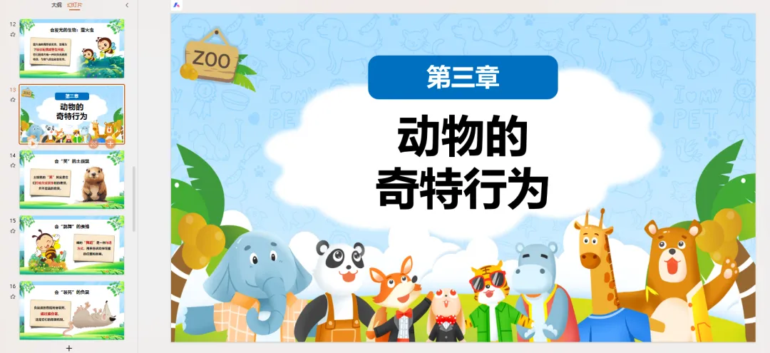 PPT页面 13-16: 动物的奇特行为动物们不仅本领奇特,行为也很有趣!