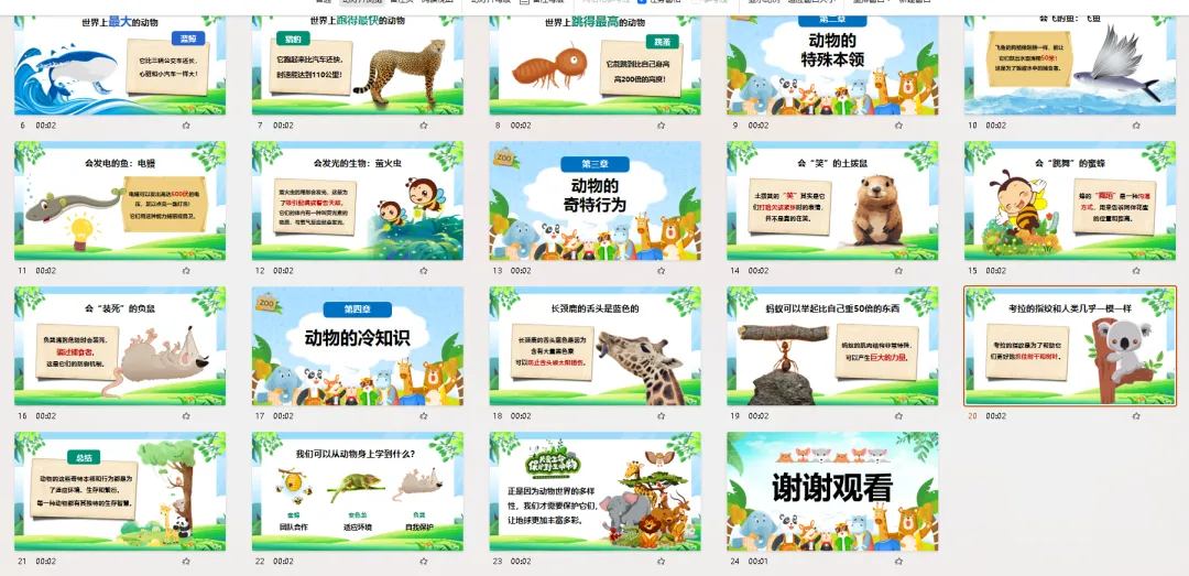 PPT页面 17-20: 动物的冷知识最后,我们来分享一些关于动物的冷知识!