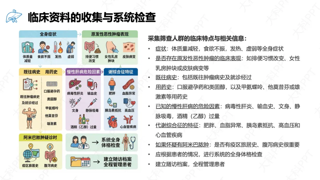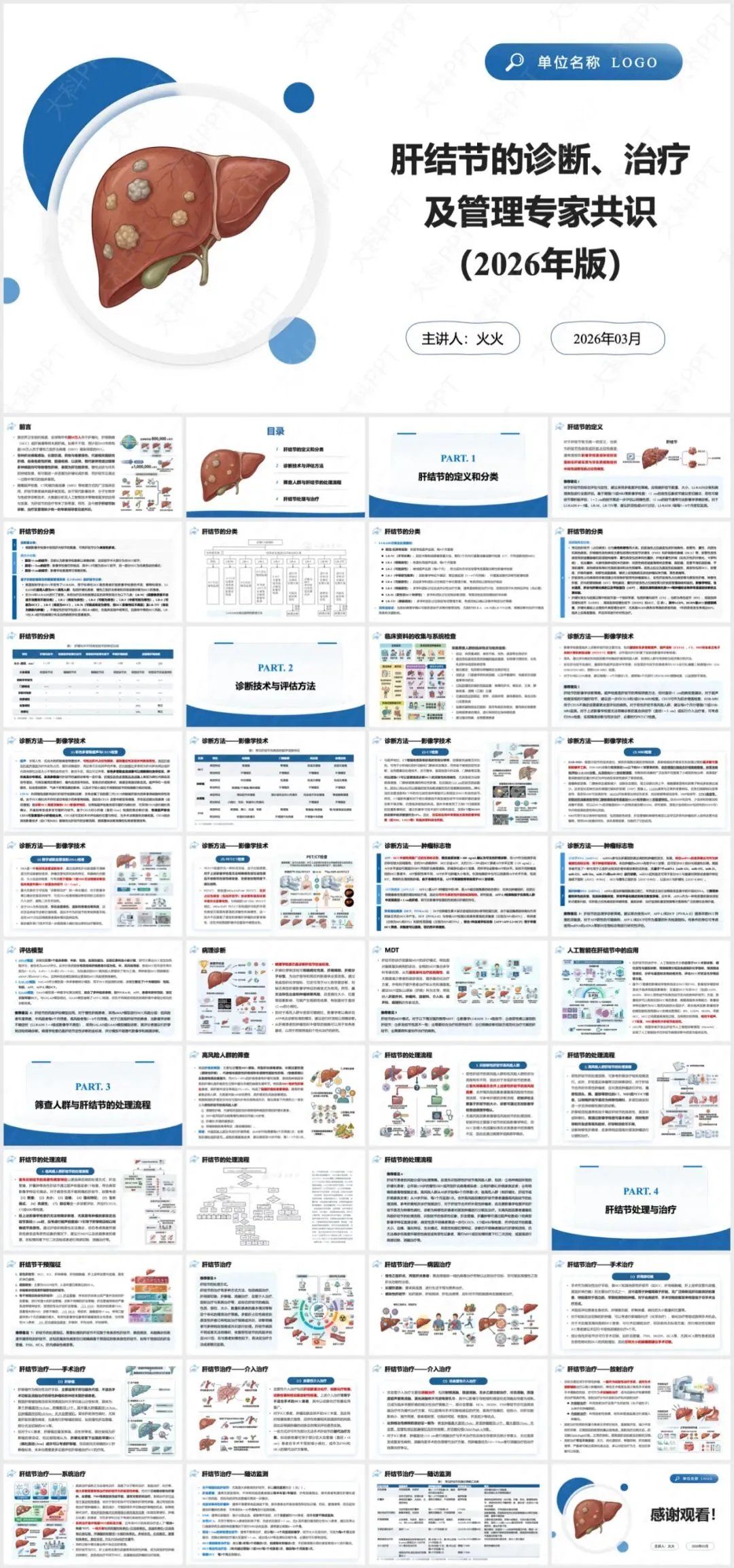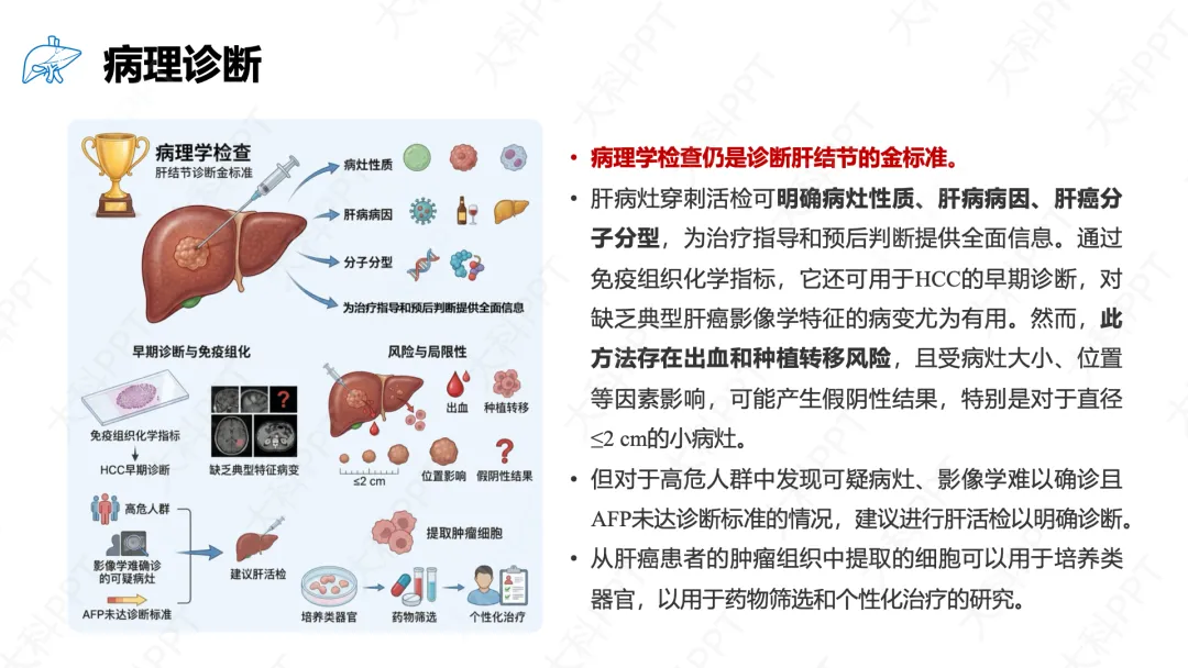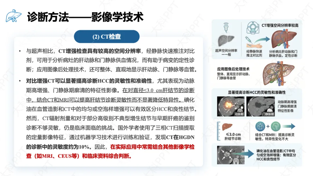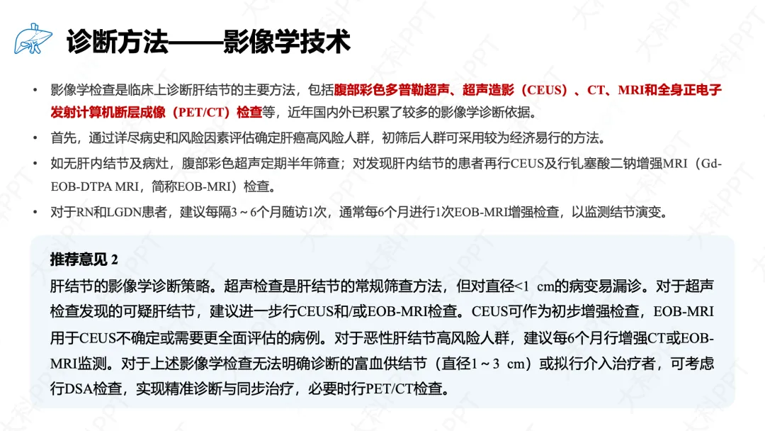 肝结节诊断需先系统收集临床资料,涵盖病史、症状、危险因素等并完成体格检查,建立随访档案。影像学是核心手段,超声为常规筛查,可疑结节需进一步行 CEUS 和 / 或 EOB-MRI,CEUS 对小肝癌诊断效能更优,疑难富血供结节可考虑 DSA,PET/CT 作为补充。血清学推荐联合 AFP、AFP-L3、DCP,有条件可检测 miRNA、ctDNA 等新兴标志物。同时可借助 aMAP、GALAD、GAAD 等模型做风险分层和辅助诊断,病理活检为定性金标准,必要时结合 MDT 模式。人工智能技术也已应用于结节诊断、疗效评估等,能提升诊断准确性与效率,为临床决策提供支撑。(仅展示部分ppt)