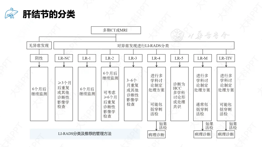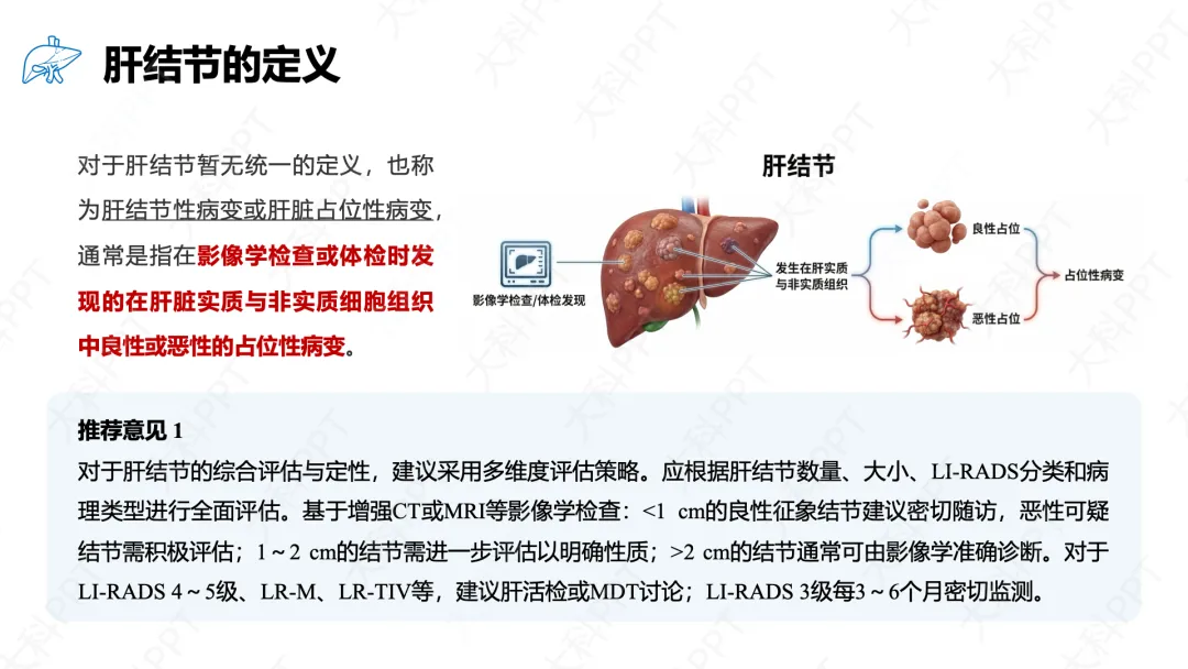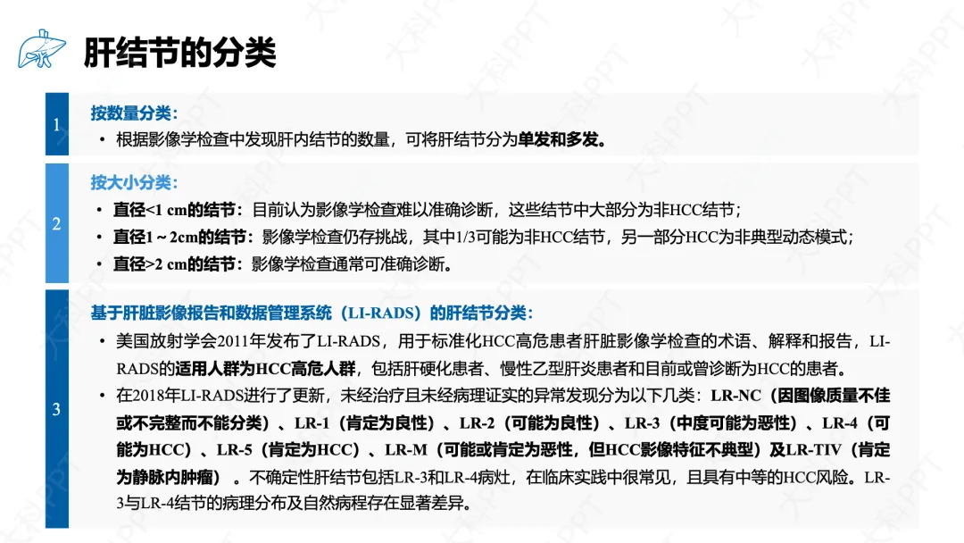 肝结节暂无统一定义,亦称肝结节性病变 / 肝脏占位性病变,是影像学或体检发现的肝脏良恶性占位性病变。其分类维度多元,按数量分单发、多发;按大小分<1cm、1~2cm、>2cm,尺寸越小影像学诊断难度越高。基于 LI-RADS 可分为 LR-NC 至 LR-TIV 等类别,其中 LR-3/4 为不确定性结节,恶变风险差异显著,需不同频次监测或活检。按病理可分良恶性,良性含肝细胞性、胆管性等病变,恶性含原发性(如 HCC)和转移性肿瘤;肝硬化相关结节呈组织学谱,从再生结节到高级别异型增生结节(HGDN),HGDN 癌前病变 5 年恶变率达 80%,需高度重视。临床需结合多维度分类综合评估结节性质。(仅展示部分ppt)
