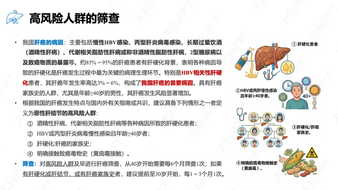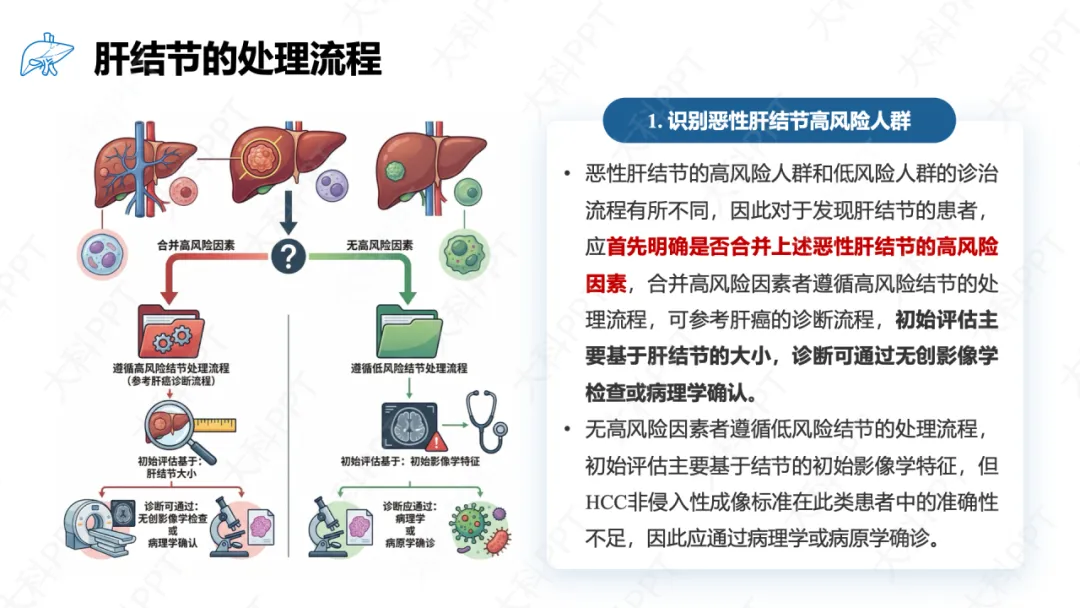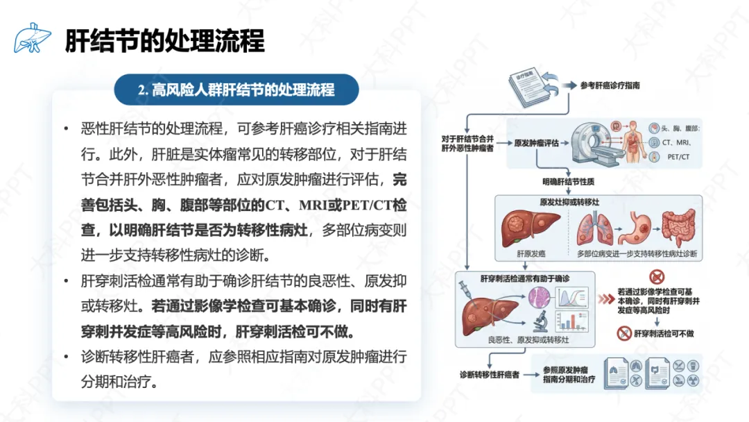 恶性肝结节高风险人群包括各类肝硬化患者、≥40 岁慢性肝炎感染者、有相关家族史或致癌毒物接触史者,极高危人群(肝硬化 / 肝癌家族史等)筛查提前至 30 岁,高风险人群 40 岁起每 6 个月筛查,极高危者每 3 个月监测。处理流程先区分高低风险人群,高风险者参考肝癌诊疗指南,合并肝外肿瘤需排查转移灶,影像学确诊且活检高风险时可免做活检。低风险者先识别结节良恶性征象,典型良性结节可直接诊断,性质不明者需进一步做影像学检查,评估结节数量、大小等特征,仍无法确诊者建议肝穿刺活检,高度怀疑恶性者需行 MDT,或二次活检、局部切除 / 消融治疗。(仅展示部分ppt)