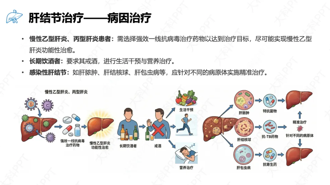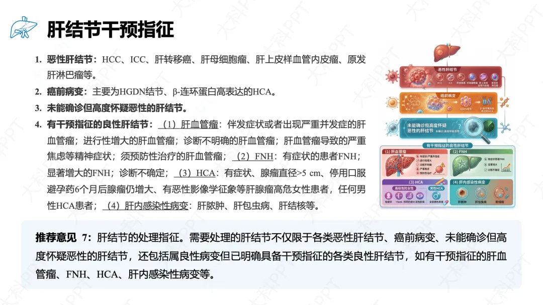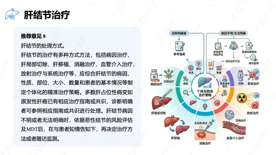 肝结节干预涵盖恶性结节、癌前病变、高度可疑恶性结节及有指征的良性结节,如伴症状的肝血管瘤、直径>5cm 的肝细胞腺瘤等。治疗遵循个体化原则,先开展病因治疗,如肝炎抗病毒、饮酒者戒酒等。手术治疗含肝局部切除和肝移植,为恶性结节根治性手段,部分良性结节也可手术。介入治疗分血管性和非血管性,消融治疗是早期肝癌重要根治手段,适用于部分良性结节。放疗多为恶性结节姑息或辅助治疗,系统治疗以靶向 + 免疫为主,用于中晚期肝癌等恶性结节。无干预指征的结节以随访监测为主,不同性质结节的随访周期、检查方法各有规范,需根据病情动态调整。(仅展示部分ppt)