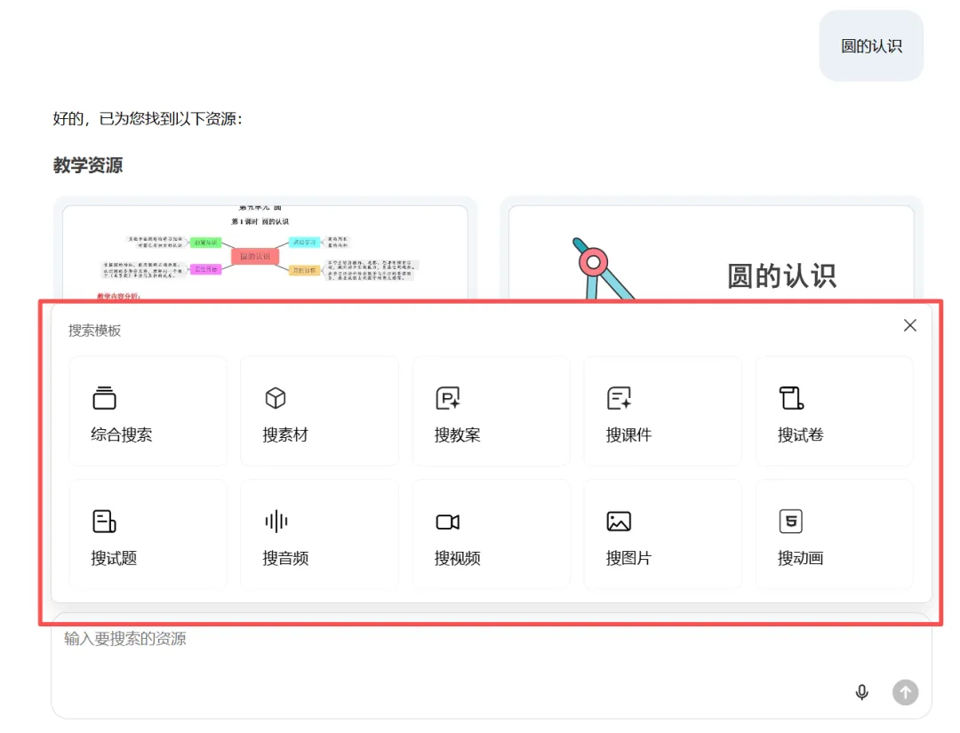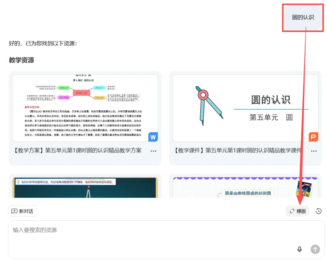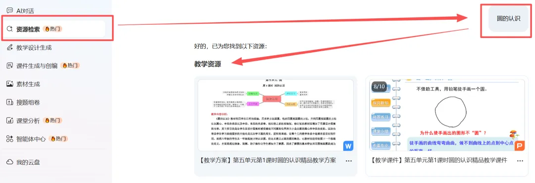 打开【资源检索】,输入课题名称(比如《圆的认识》)