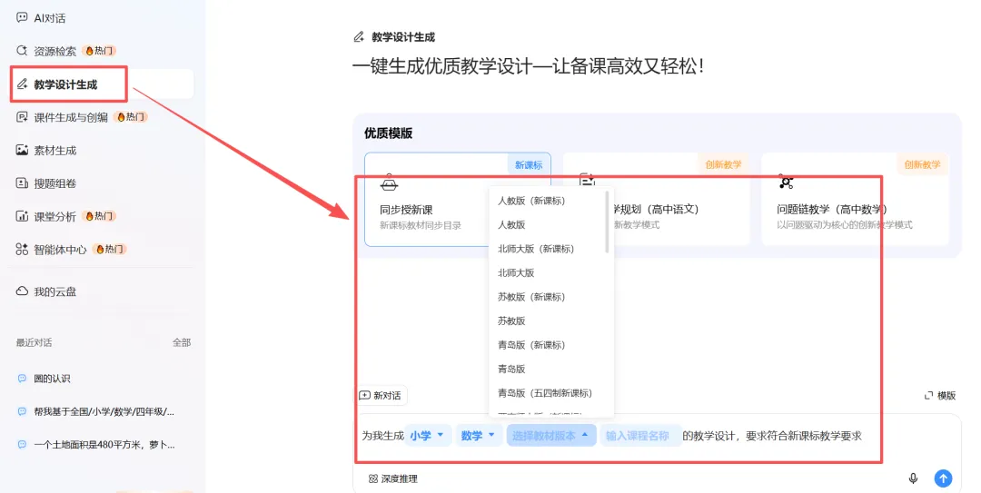 切换到【教学设计生成】,选择学段、学科、教材版本(如小学数学人教版新课标)