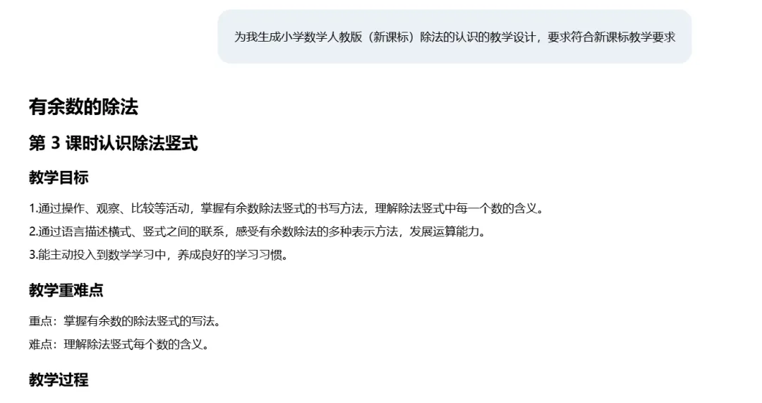 输入课程名,AI 自动生成完整教学设计:包含教学目标、重难点、教学过程等