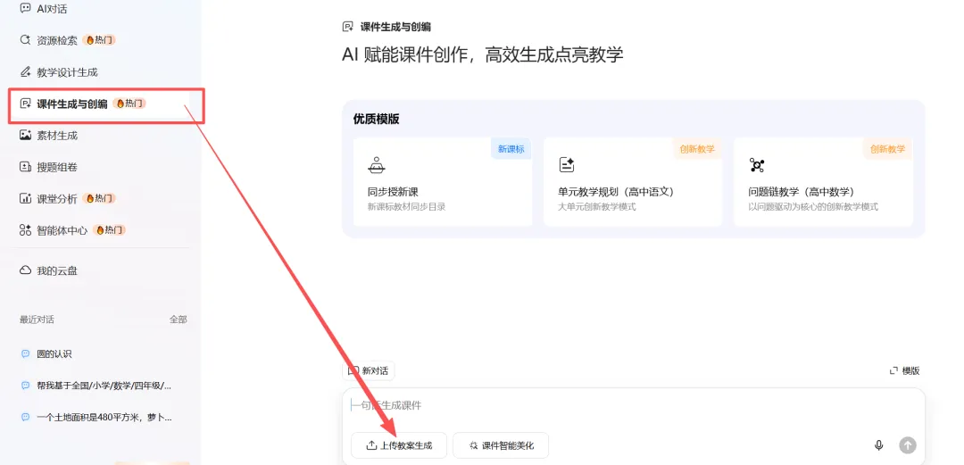 进入【课件生成与创编】,选择【上传教案生成】