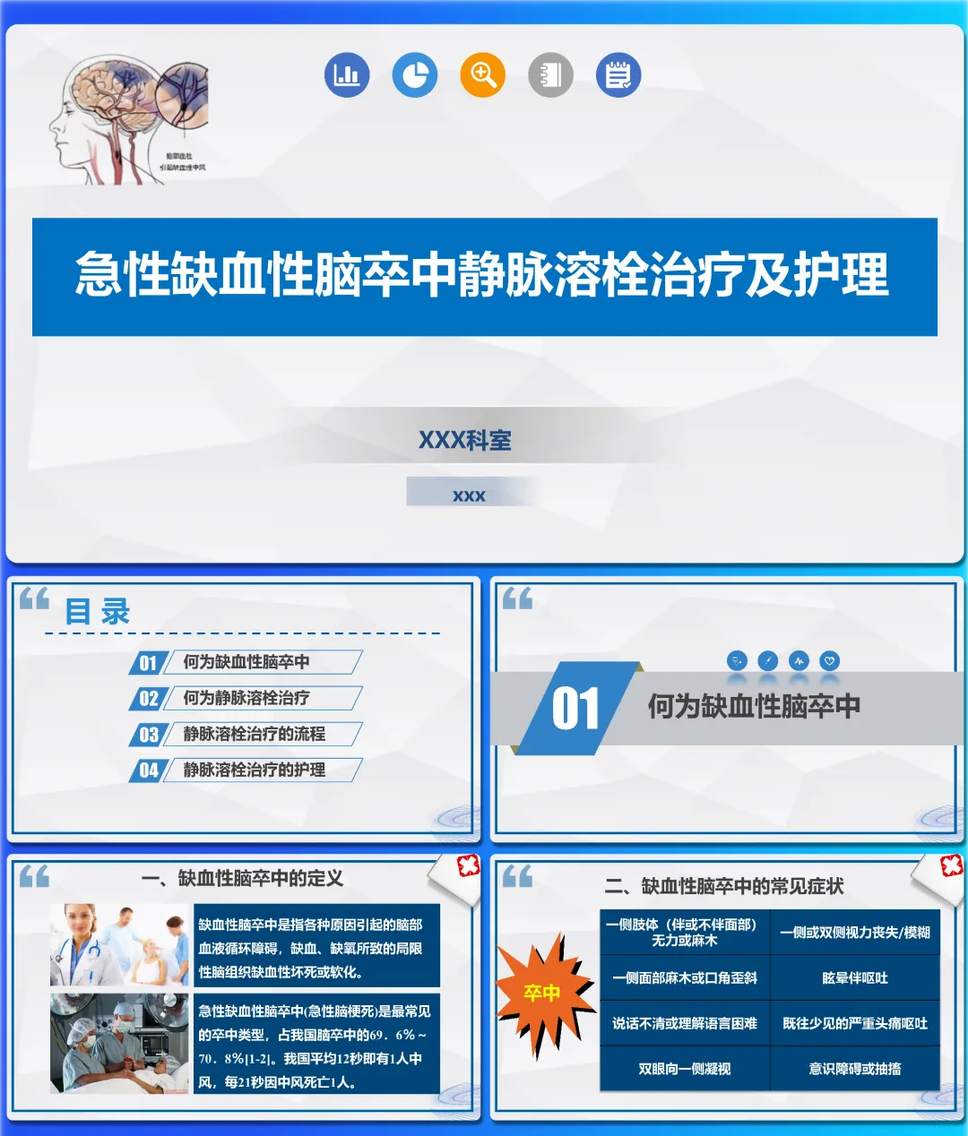 我是医览PPT,专注医护PPT课件,每天给大家带来各类医护课件(完整课件获取方式请看文末)时间就是大脑,时间就是生命。今天聚焦“急性缺血性脑卒中静脉溶栓治疗及护理”,这是一场与时间的赛跑,每个环节的提速都意味着神经功能的保全。