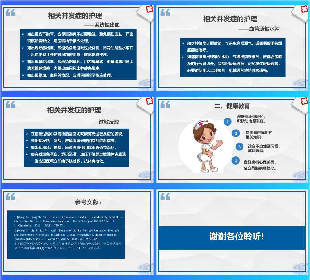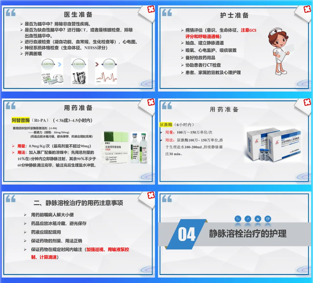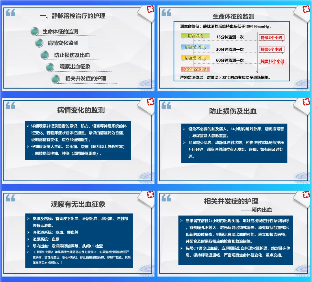 第四部分,静脉溶栓治疗的护理:重点在于溶栓后的严密监护。系统列出生命体征、神经功能、出血征象(特别是颅内出血)的观察要点,并明确各类并发症(如出血、过敏、再灌注损伤)的应急预案与护理措施。