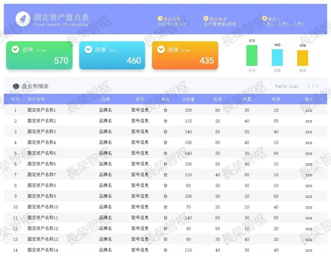 ✅ 核心亮点:自带自动统计功能,无需手动计算!录入固定资产基础信息(名称、规格、原值、使用部门等),自动生成盘点汇总数据,支持一键核对盘盈盘亏,避免手动统计出错,适合月度、季度、年度固定资产盘点使用,新手也能快速上手。