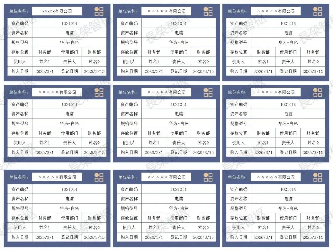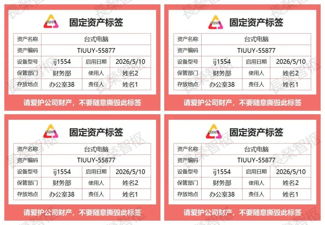 ✅ 核心亮点:简约通用型标签模板,预设规范格式,可编辑资产编号、名称、规格、使用部门、责任人等信息,适配A4纸打印,裁剪后直接粘贴,清晰标注资产归属,避免资产混淆、丢失,适合各类办公设备、生产设备标签制作。