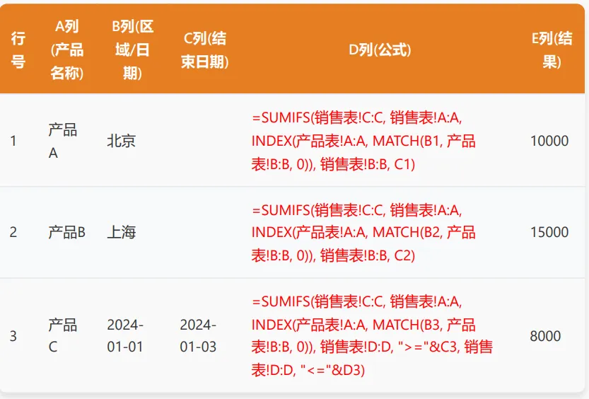 功能:使用INDEX+MATCH进行数据查询,然后使用SUMIFS进行多条件求和