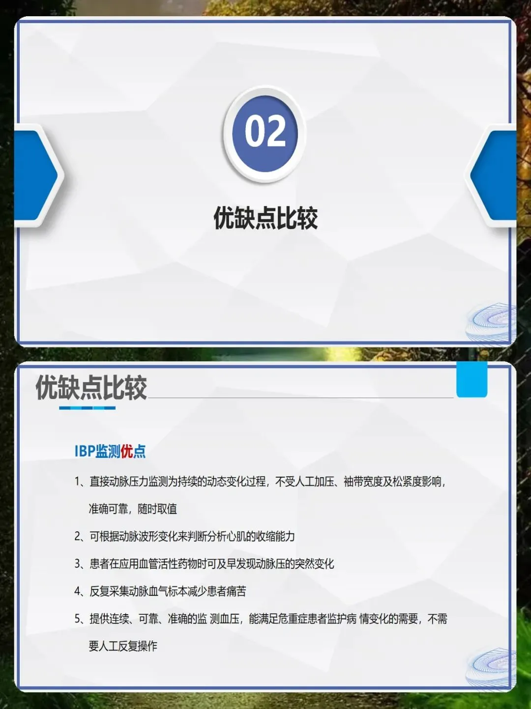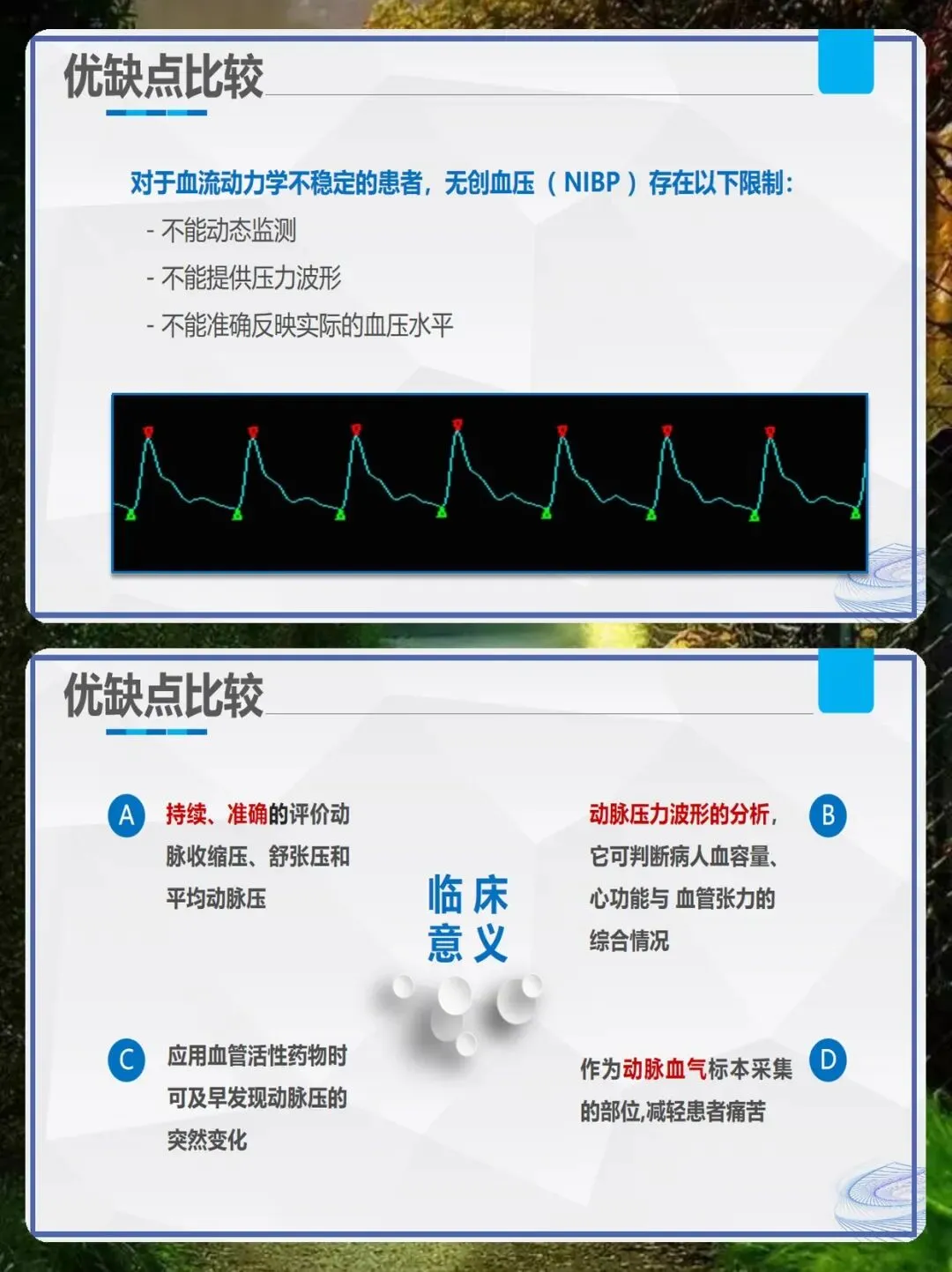 【第一部分:定义与原理】首先,什么是IBP?简单来说,血压是血管内流动的血液对血管壁的侧压力。而有创血压监测,是通过在血管内放置导管,直接测量动脉压力的一种方法。与我们平时使用的无创袖带血压(NBP)相比,它最大的优势在于:它是持续的、动态的,不受人工加压、袖带宽度或松紧度的影响,数据准确可靠。
