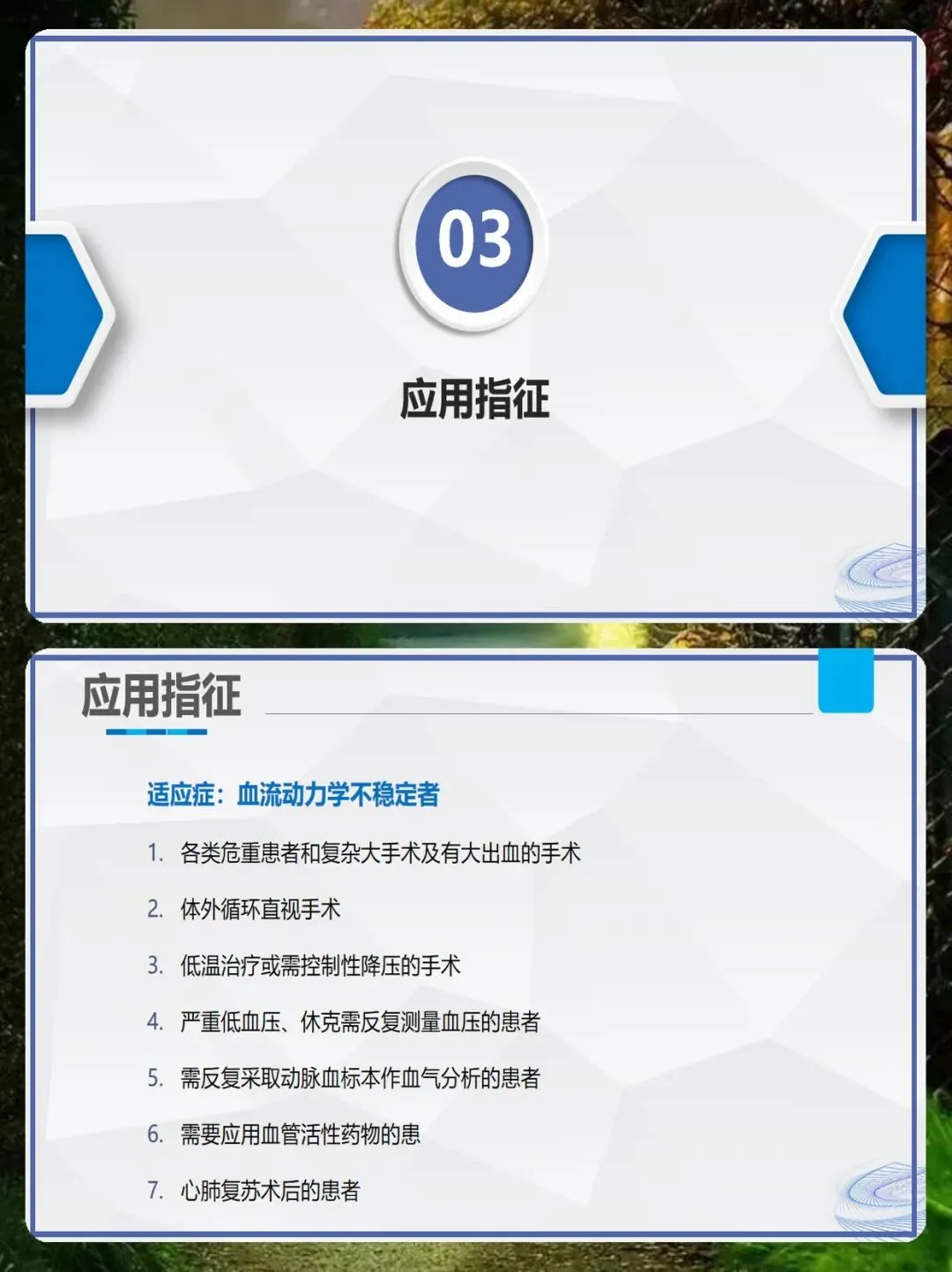 【第二部分:应用指征与禁忌】既然IBP如此精准,它的适应症主要集中在血流动力学不稳定的患者。具体包括:各类危重患者、复杂的大手术或预计有大出血的手术、体外循环直视手术、低温治疗或需控制性降压的手术、严重低血压或休克需反复测量者、需要反复采集血气标本的患者,以及应用血管活性药物的患者。