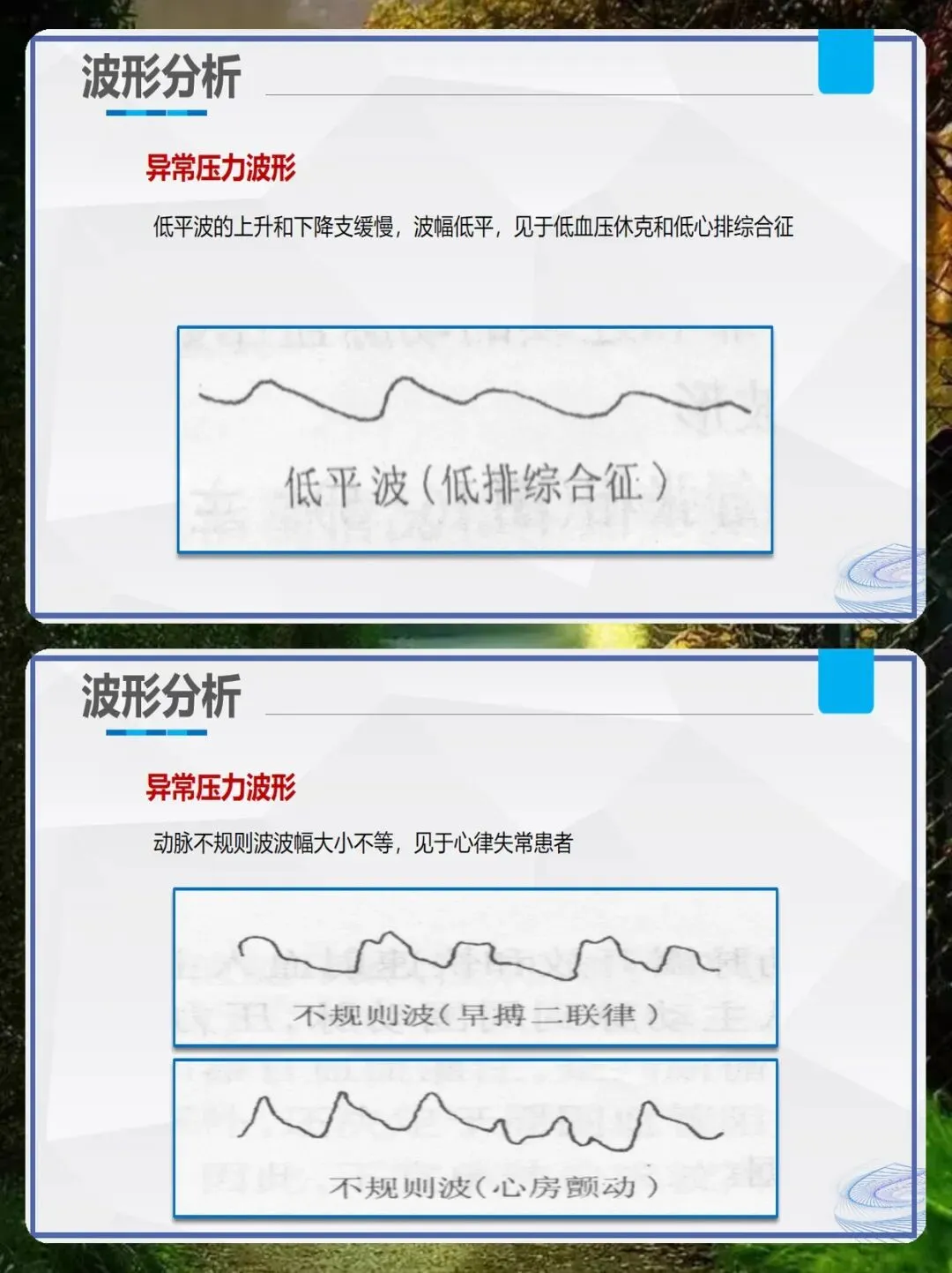 然而,临床中我们常会遇到异常波形。如果波形圆钝、上升支缓慢,往往提示心肌收缩功能低落或血容量不足;如果波形低平、波幅低,常见于低血压休克;如果波幅大小不等,则多见于心律失常;而波形高尖、舒张压低,则可能提示高血压或主动脉瓣关闭不全。