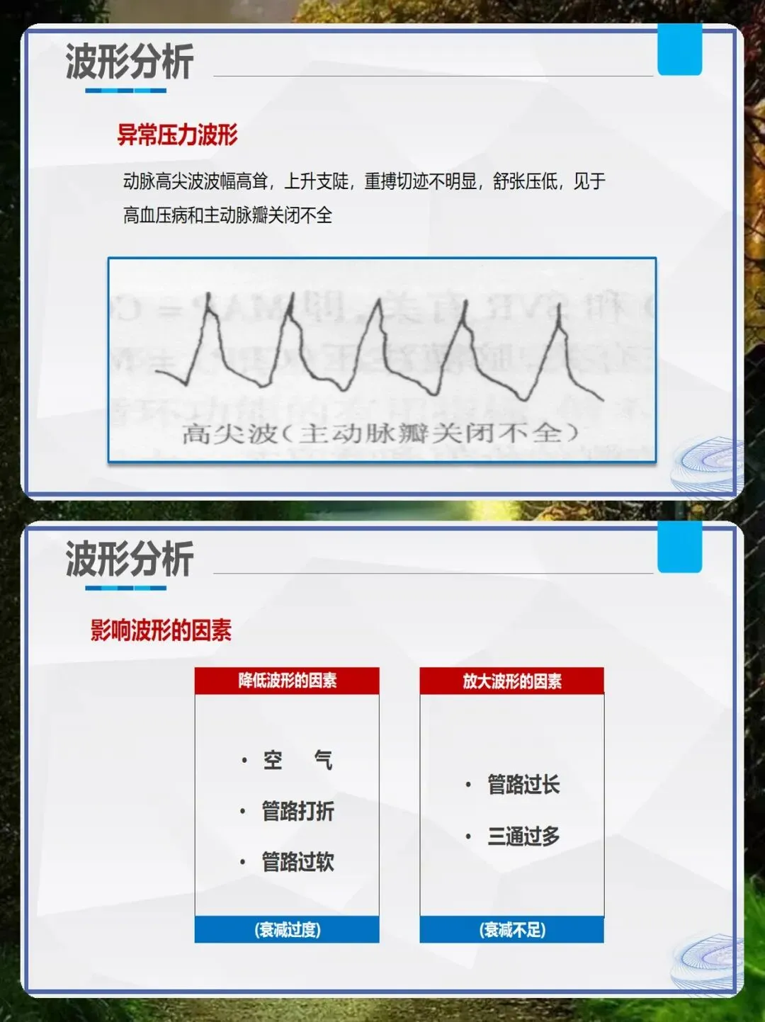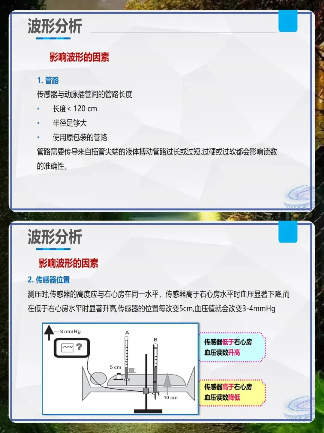 这里要特别提醒大家,波形的准确性会受到多种因素干扰。管路中的空气、打折或管路过软,会导致波形衰减过度;而管路过长或三通过多,则可能导致衰减不足。此外,传感器的位置必须与右心房在同一水平,位置每改变5厘米,读数就可能产生3-4毫米汞柱的误差。
