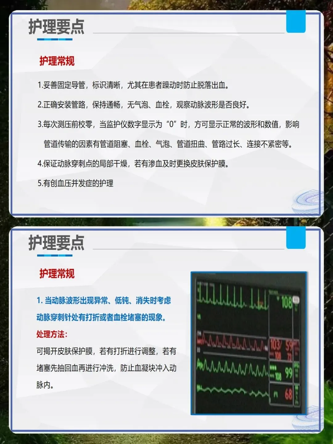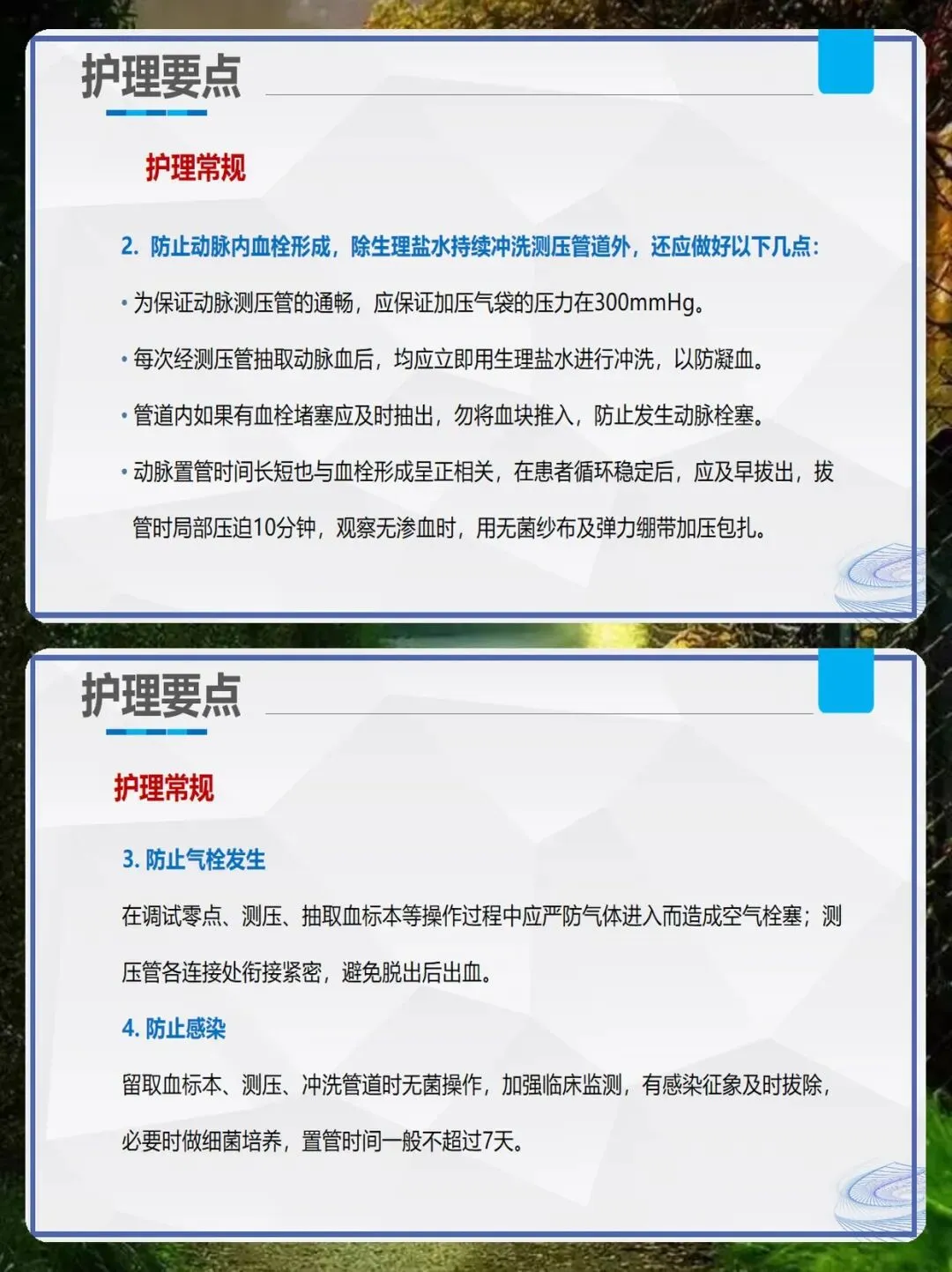 我们的护理核心在于“防”和“通”。第一,要妥善固定导管,标识清晰,防止脱落。第二,必须保证管路通畅无气泡。我们要利用加压气袋,保证压力在300mmHg,以维持持续冲洗,防止血栓堵塞。第三,严防气栓。在调试零点、测压或采血时,必须严防气体进入,连接处必须衔接紧密。