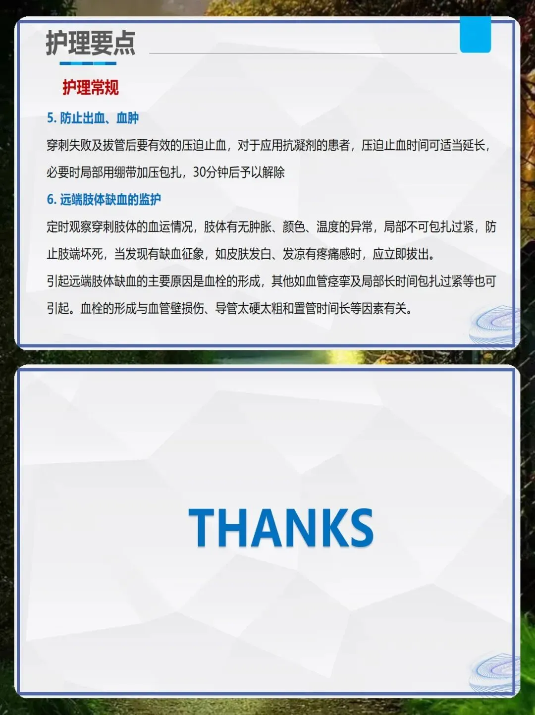 关于感染控制,置管时间一般不超过7天,穿刺点要保持干燥,一旦发现感染征象应及早拔除。最后,我们要时刻警惕远端肢体缺血。定时观察穿刺肢体的皮肤颜色、温度和感觉,一旦发现皮肤发白、发凉或疼痛,必须立即拔管,防止肢体坏死。