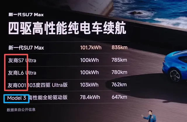 如下图所示,在展示续航成绩时,雷军将新一代SU7的成绩,与另外4家进行了对比。