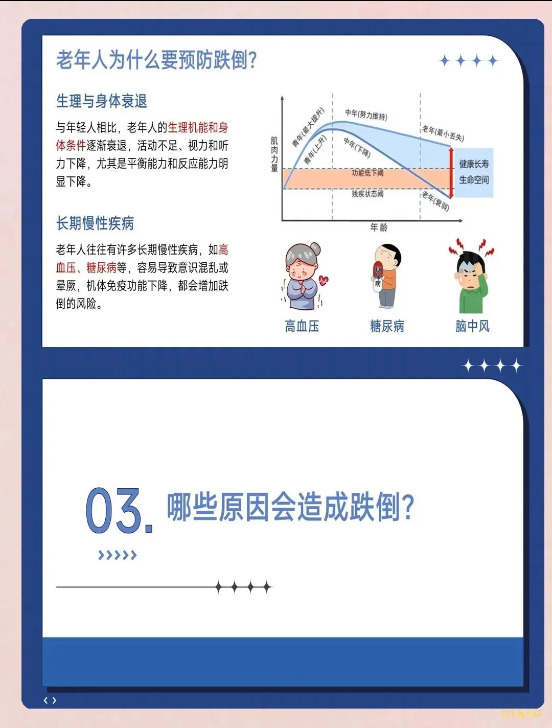 老年患者是跌倒的最高危人群。随着年龄增长,老年人的平衡能力、反应速度、肌肉力量都会下降,加上多种疾病共存、多重用药,跌倒风险显著增加。很多护士认为"老年人跌倒是正常的",这种观念是错误的,跌倒不是衰老的必然结果,而是可以通过干预预防的不良事件。