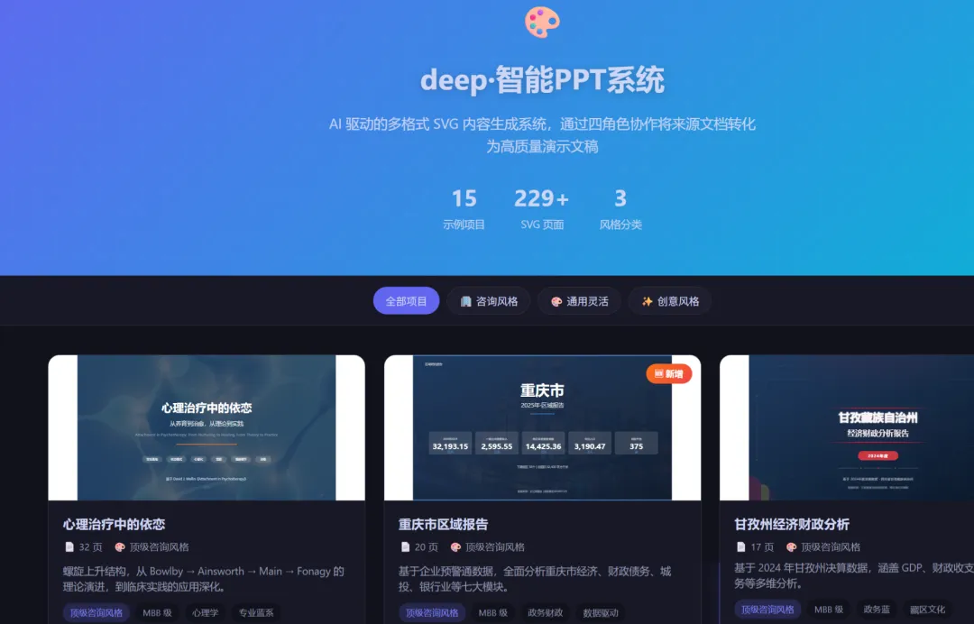 在信息爆炸的时代,如何让内容以更高效、更美观的方式呈现?Deep·智能PPT系统应运而生!这是一款基于AI的智能视觉内容生成系统,通过多角色协作,将源文档转化为高质量的SVG内容,支持演示文稿、社交媒体、营销海报等多种格式。无论是设计师、营销人员还是教育工作者,都能通过Deep·智能PPT系统轻松创建专业级视觉内容。