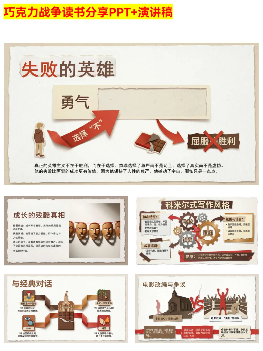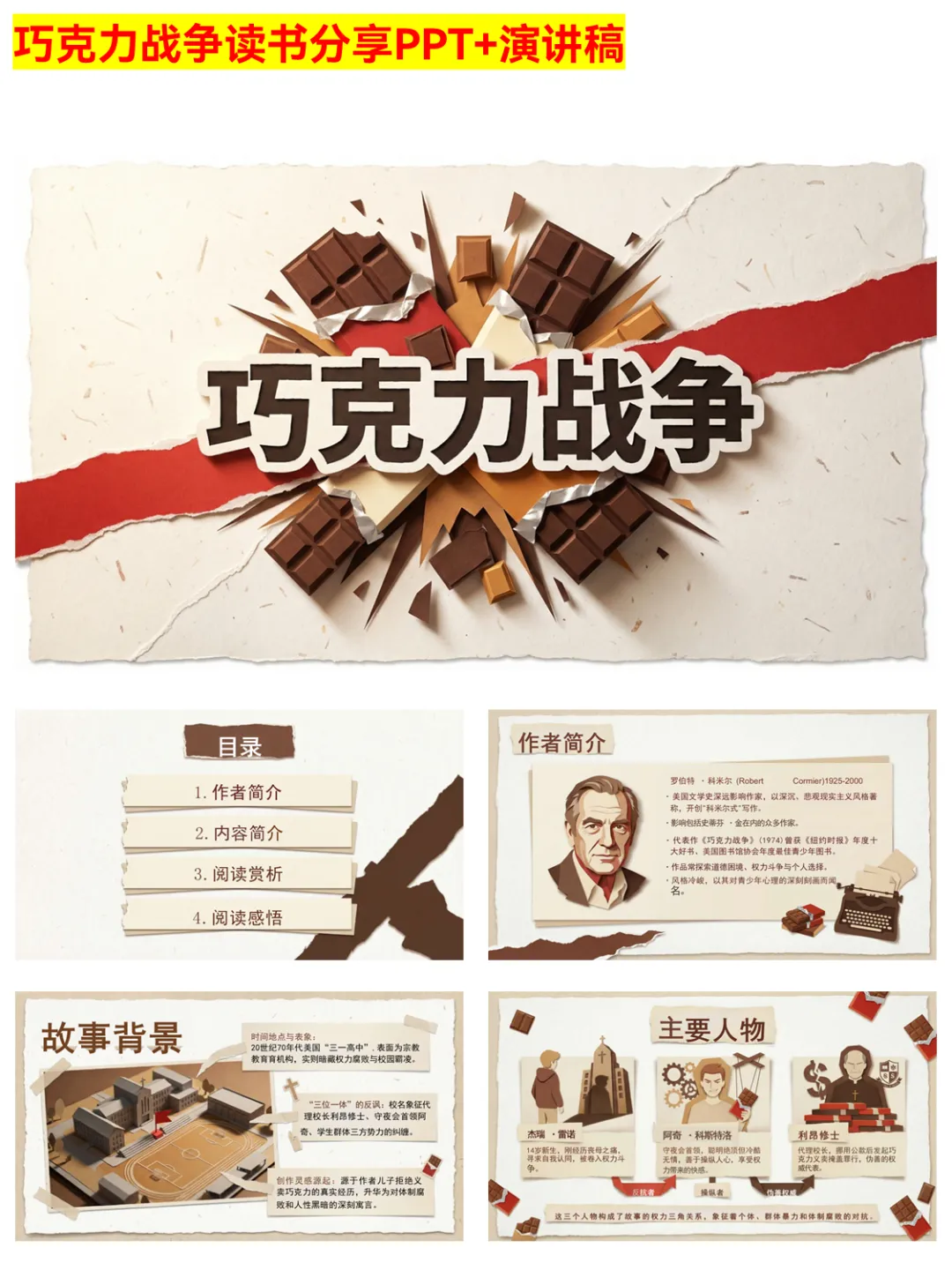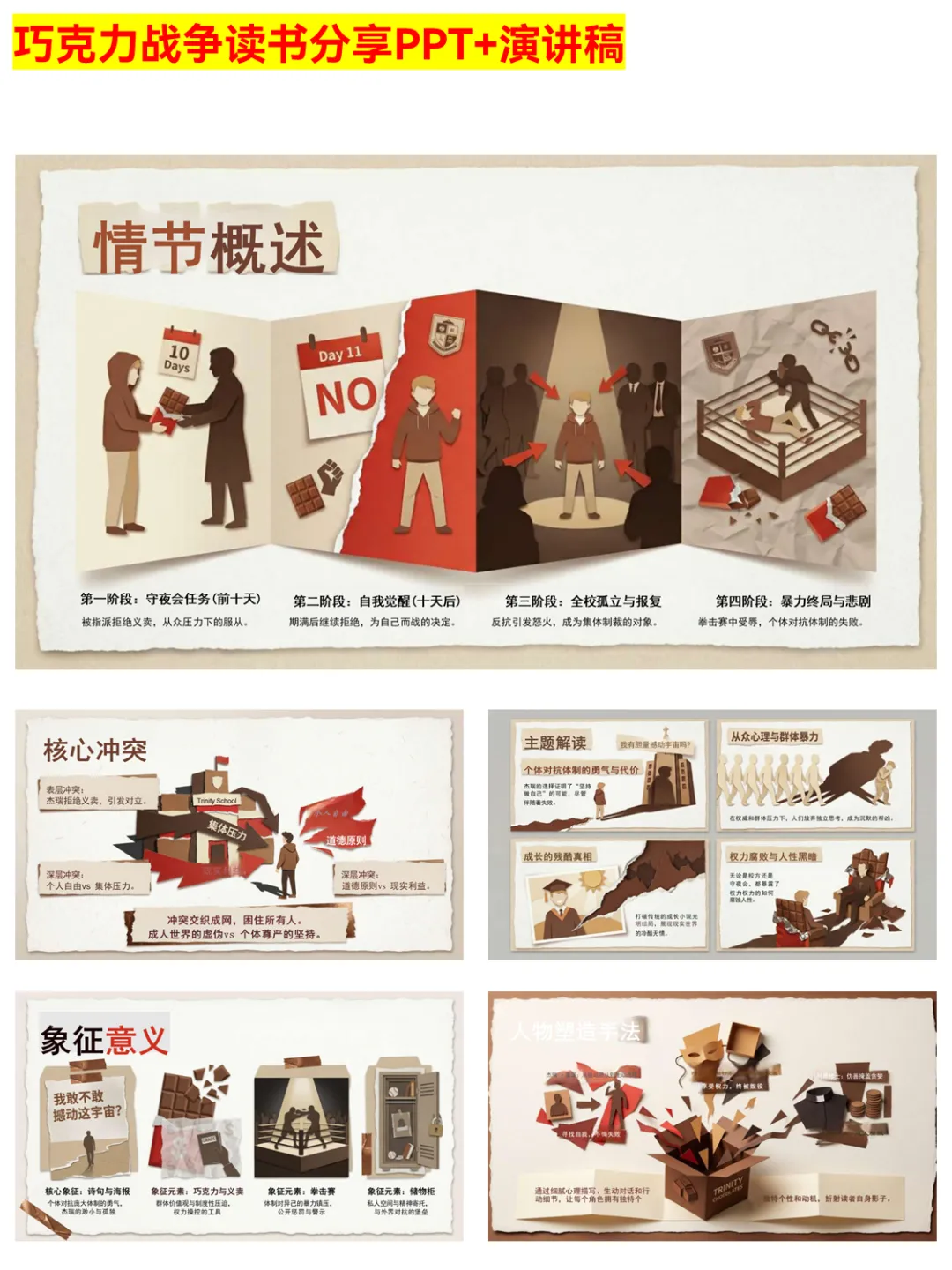 谁懂啊!这份《巧克力战争》PPT完美还原小说的深刻内涵~ 从情节四阶段到核心冲突,从人物塑造到主题解读,把“坚持自我未必胜利但有尊严”的成长真相讲透了。杰瑞的孤独反抗、阿奇的权力操控、利昂修士的伪善,每个角色都值得细品。适合学生做读书作业、文学博主分享素材,帮你快速掌握这本书的文学价值与现实意义。 #巧克力战争 #读书分享 #成长真相 #文学PPT #读书作业 #经典小说 #现实意义 #人性黑暗 #权力腐败 #独立思考