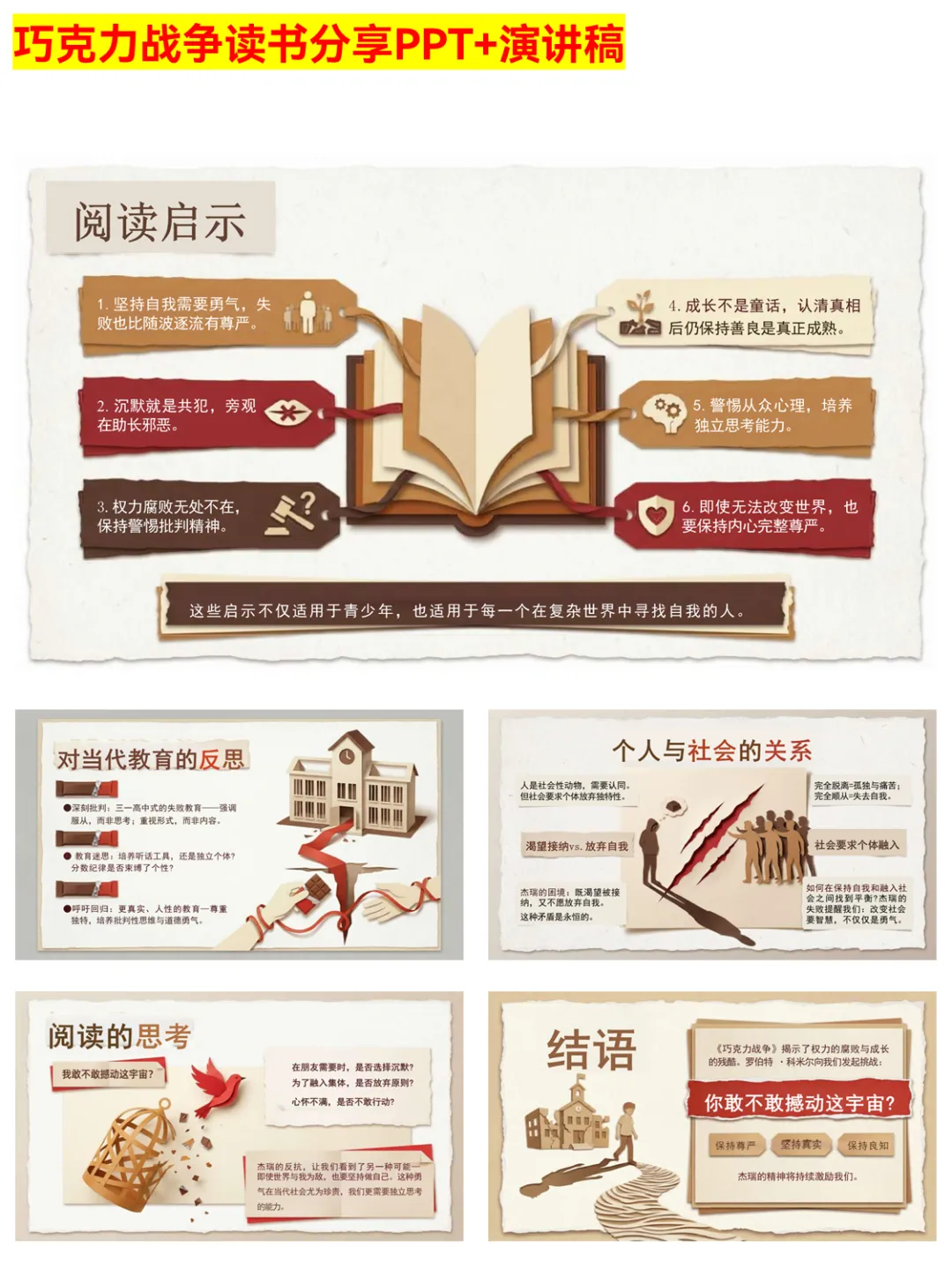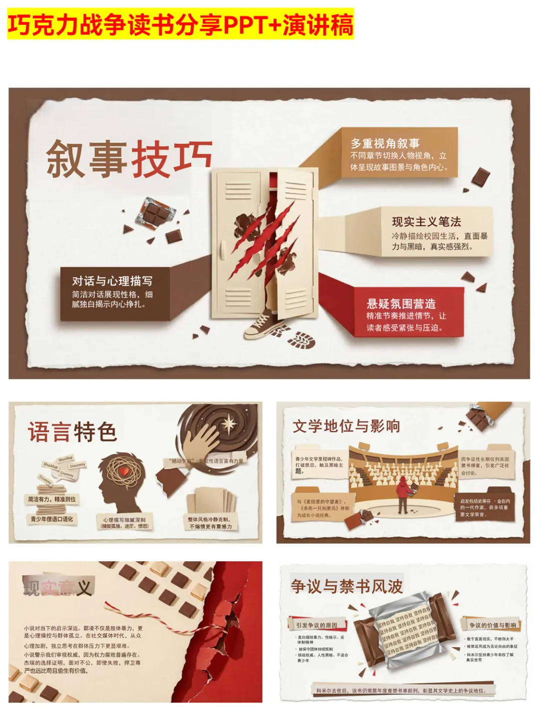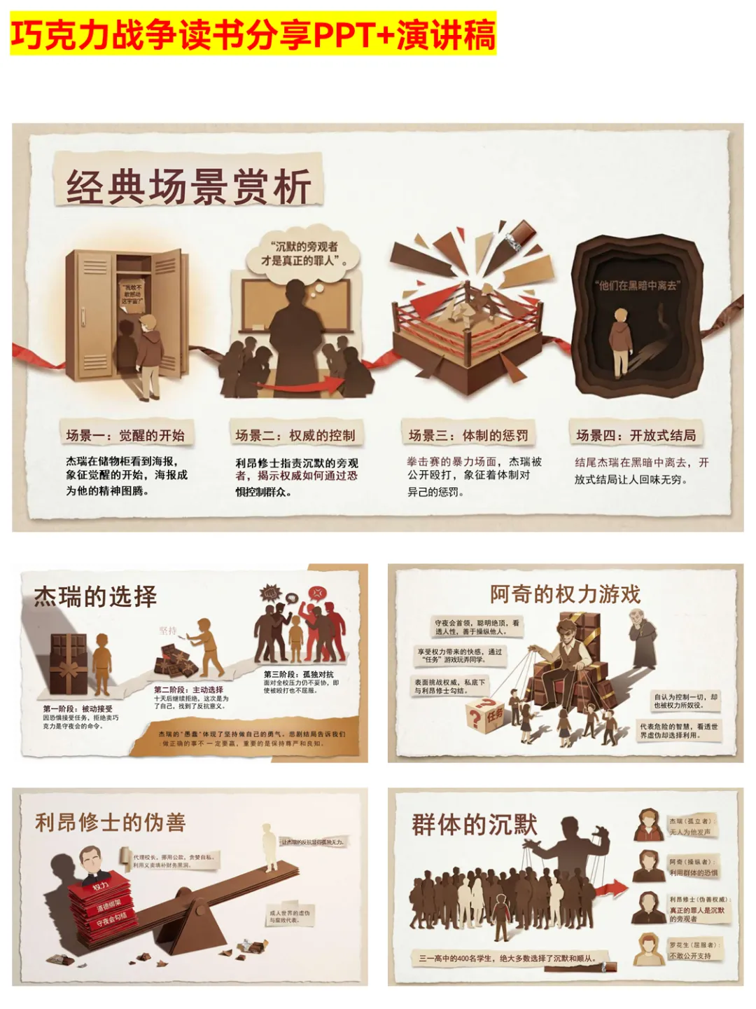 谁懂啊!这份《巧克力战争》PPT完美还原小说的深刻内涵~ 从情节四阶段到核心冲突,从人物塑造到主题解读,把“坚持自我未必胜利但有尊严”的成长真相讲透了。杰瑞的孤独反抗、阿奇的权力操控、利昂修士的伪善,每个角色都值得细品。适合学生做读书作业、文学博主分享素材,帮你快速掌握这本书的文学价值与现实意义。 #巧克力战争 #读书分享 #成长真相 #文学PPT #读书作业 #经典小说 #现实意义 #人性黑暗 #权力腐败 #独立思考