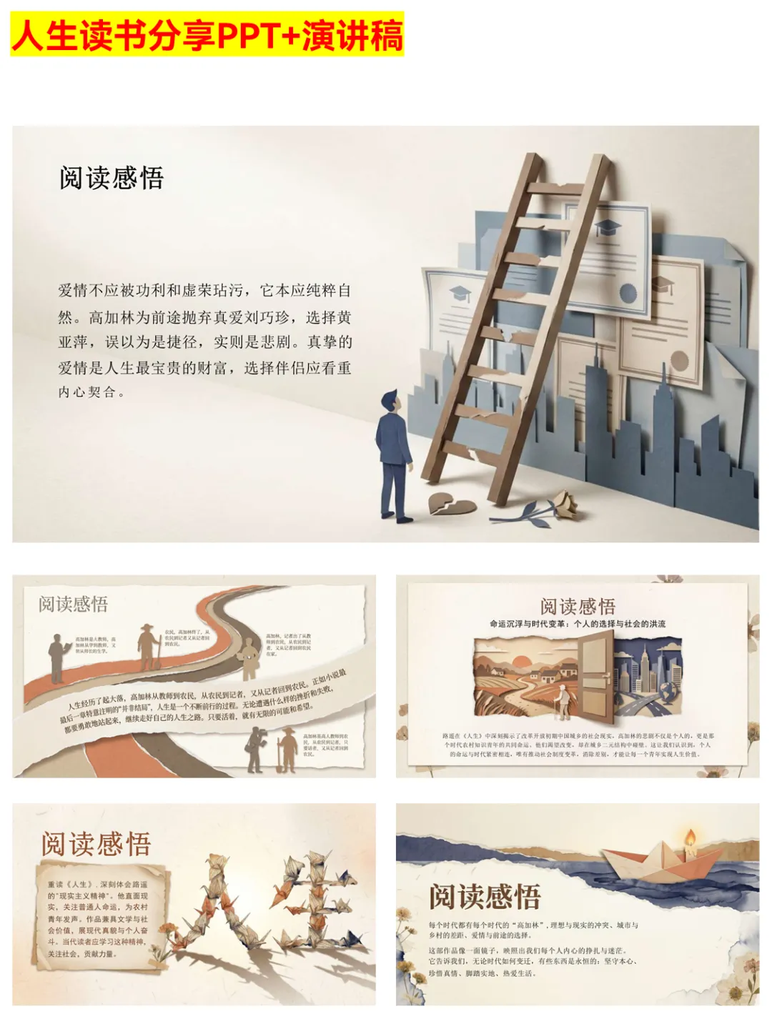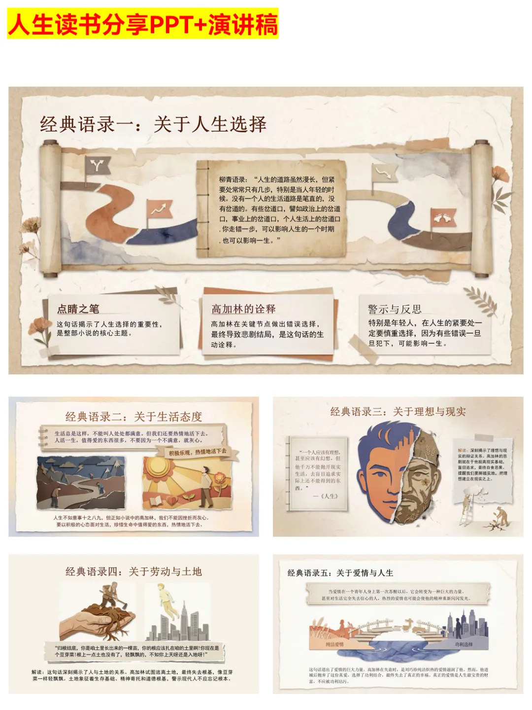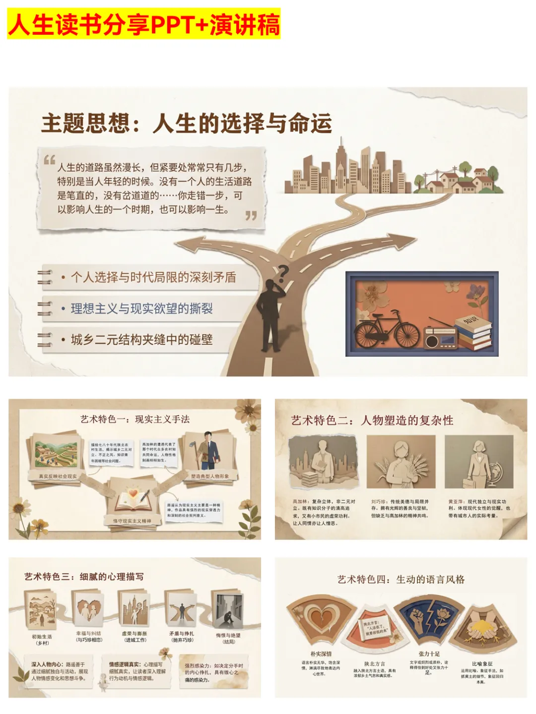 专为文学爱好者准备的《人生》读书分享PPT!聚焦作品的现实主义风格、细腻心理描写和生动语言艺术,深入探讨理想与现实、故土与奋斗的主题。包含故事脉络、人物关系图谱和经典语录解读,不管是课堂分享还是读书交流会,都能帮你精准传达作品精髓,轻松引发共鸣。 #人生读书分享 #文学PPT #经典名著解读 #阅读感悟 #路遥 #高加林命运 #文学交流 #读书干货 #名著分享 #人生主题
