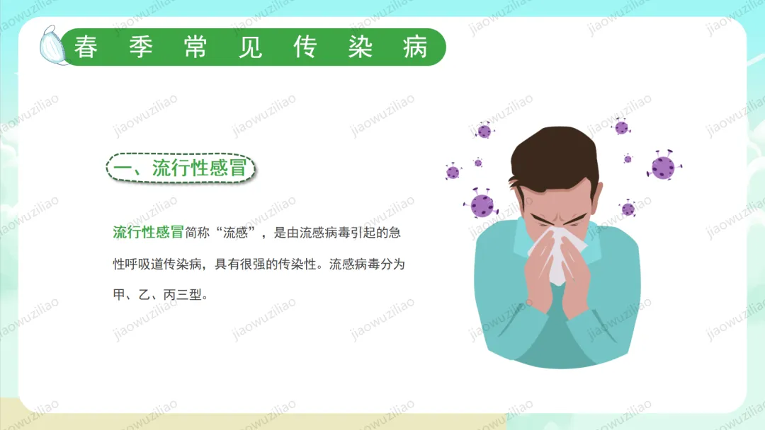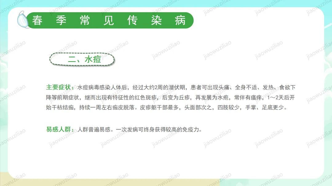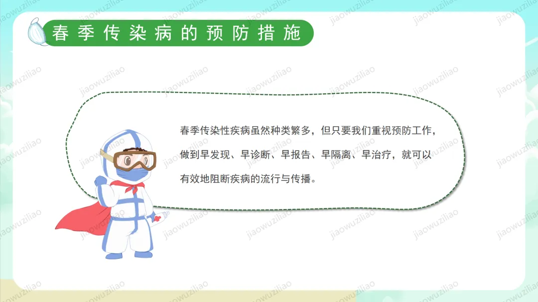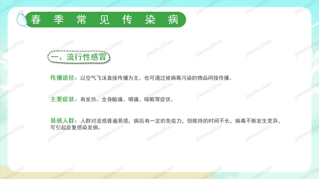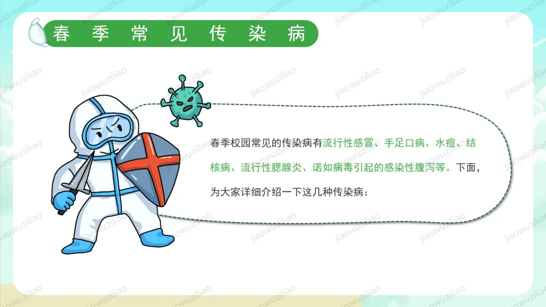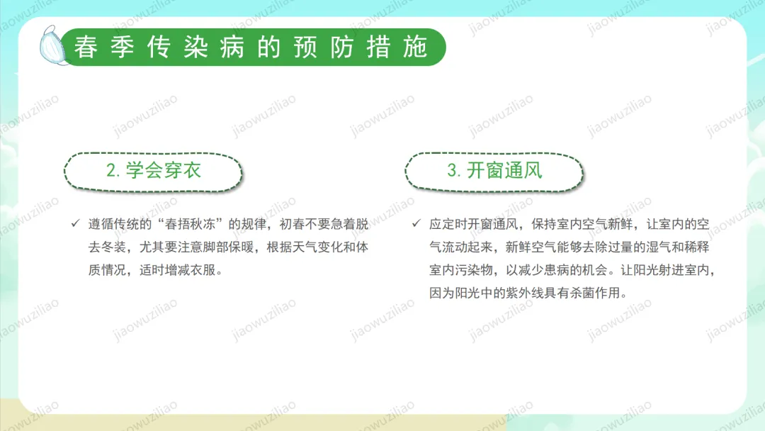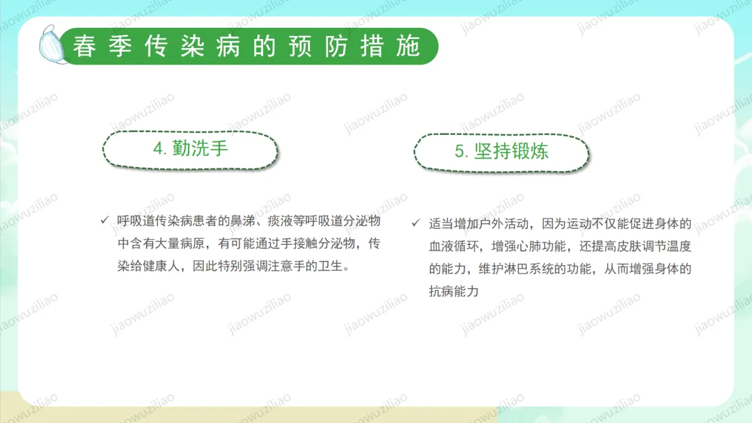 春季气温多变,是流感、水痘、诺如等传染病高发期。我们要做到:勤洗手、常通风、少聚集,注意个人卫生;合理作息、均衡饮食、加强锻炼,增强免疫力;出现不适及时就医,不带病上学。让我们共同做好防护,健康平安迎接新学期如果您对这篇课件感兴趣,文末有课件的获取方式(PPT无水印,可编辑修改)关注下方卡片公众号有偿获取。(关注后+小编好友,再发课件的编号【3134】或截图。)免责申明:此资料来源于网络公开资源,仅用于学习交流使用,售价为整理资料的费用,我们尊重原创,版权归原作者。,如果侵犯到您的权益,请第一时间联系我们,我们将立即更正或删除相关内容.