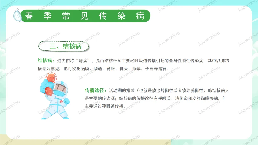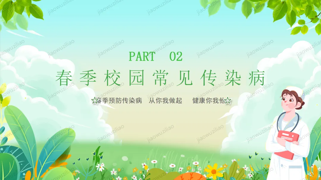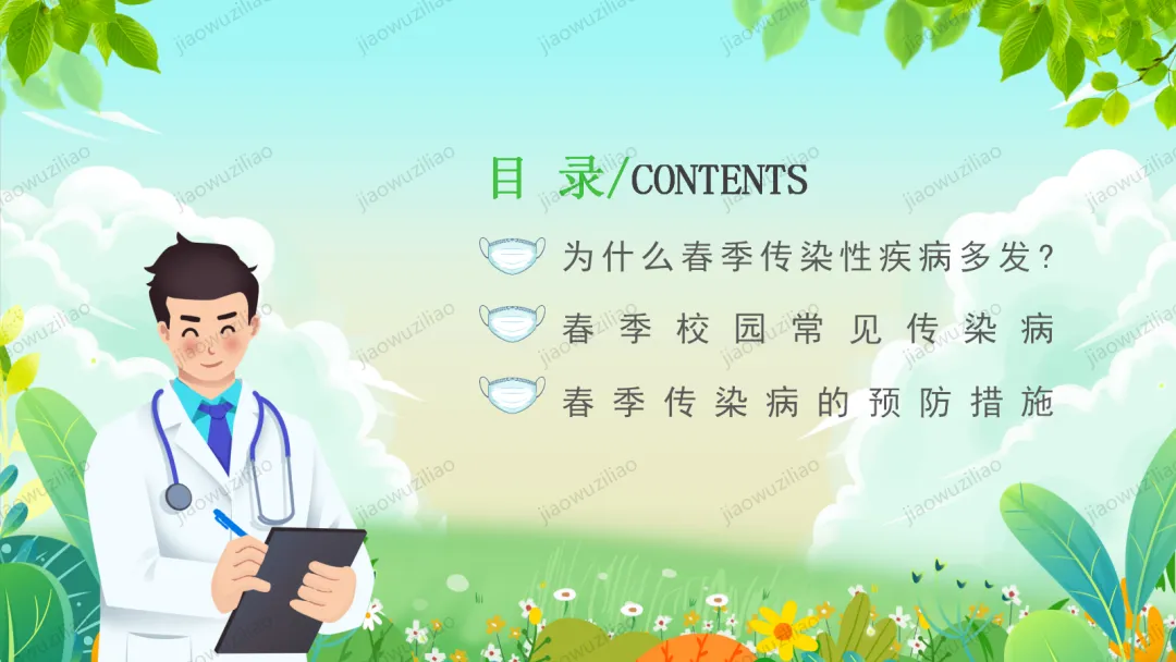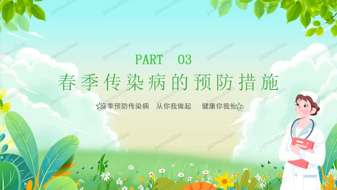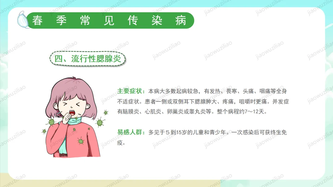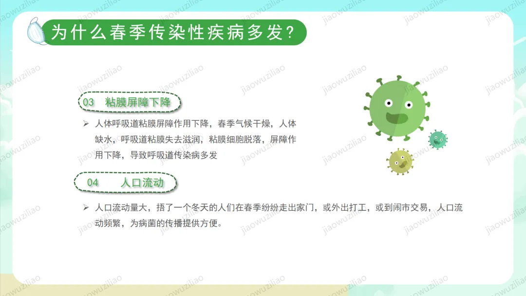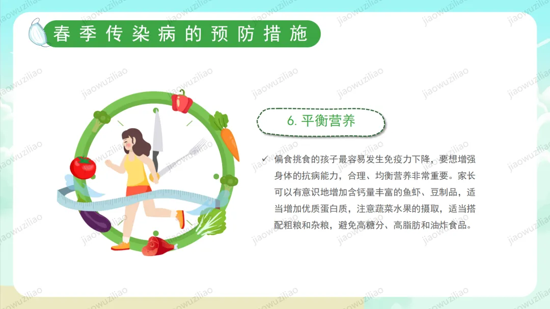 春季气温多变,是流感、水痘、诺如等传染病高发期。我们要做到:勤洗手、常通风、少聚集,注意个人卫生;合理作息、均衡饮食、加强锻炼,增强免疫力;出现不适及时就医,不带病上学。让我们共同做好防护,健康平安迎接新学期如果您对这篇课件感兴趣,文末有课件的获取方式(PPT无水印,可编辑修改)关注下方卡片公众号有偿获取。(关注后+小编好友,再发课件的编号【3134】或截图。)免责申明:此资料来源于网络公开资源,仅用于学习交流使用,售价为整理资料的费用,我们尊重原创,版权归原作者。,如果侵犯到您的权益,请第一时间联系我们,我们将立即更正或删除相关内容.