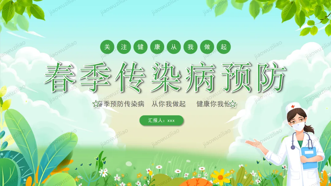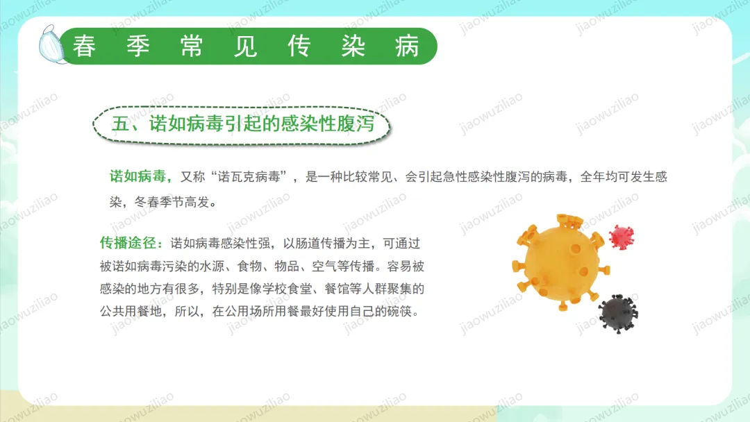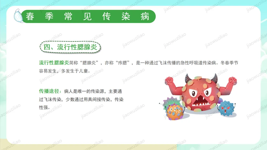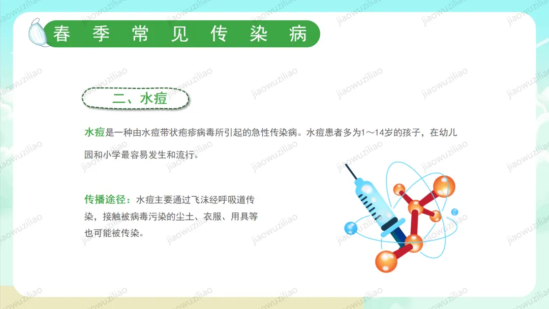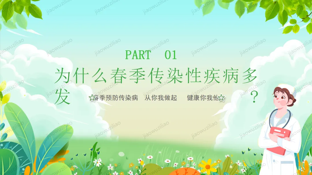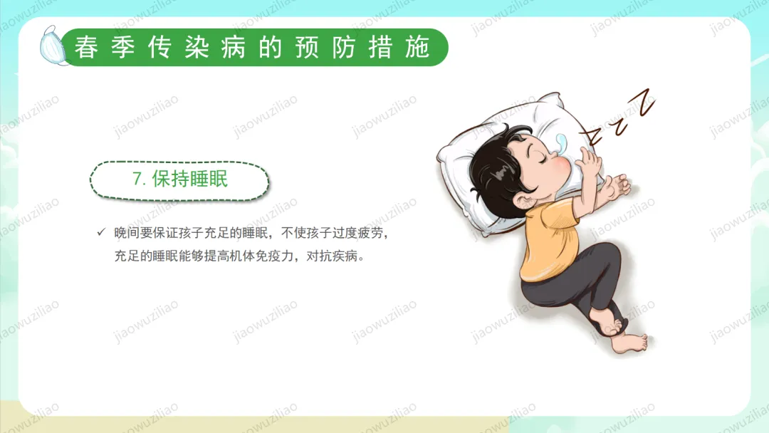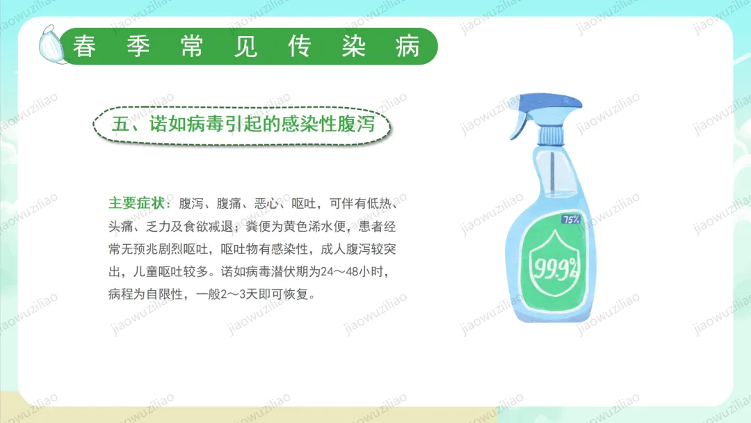春季气温多变,是流感、水痘、诺如等传染病高发期。我们要做到:勤洗手、常通风、少聚集,注意个人卫生;合理作息、均衡饮食、加强锻炼,增强免疫力;出现不适及时就医,不带病上学。让我们共同做好防护,健康平安迎接新学期如果您对这篇课件感兴趣,文末有课件的获取方式(PPT无水印,可编辑修改)关注下方卡片公众号有偿获取。(关注后+小编好友,再发课件的编号【3134】或截图。)免责申明:此资料来源于网络公开资源,仅用于学习交流使用,售价为整理资料的费用,我们尊重原创,版权归原作者。,如果侵犯到您的权益,请第一时间联系我们,我们将立即更正或删除相关内容.
