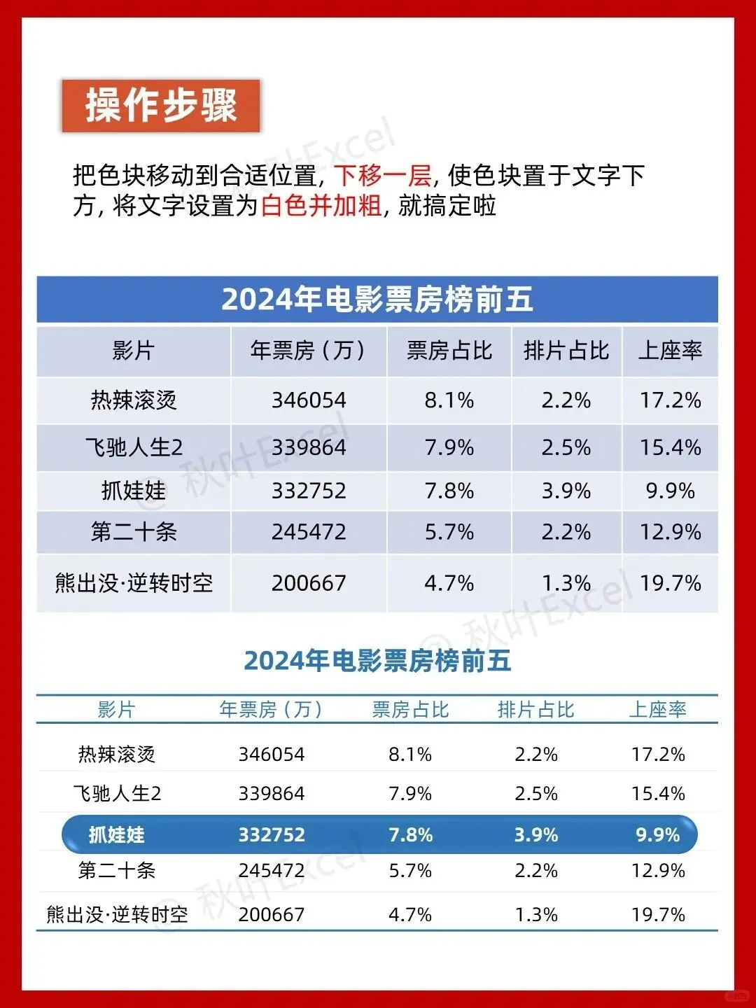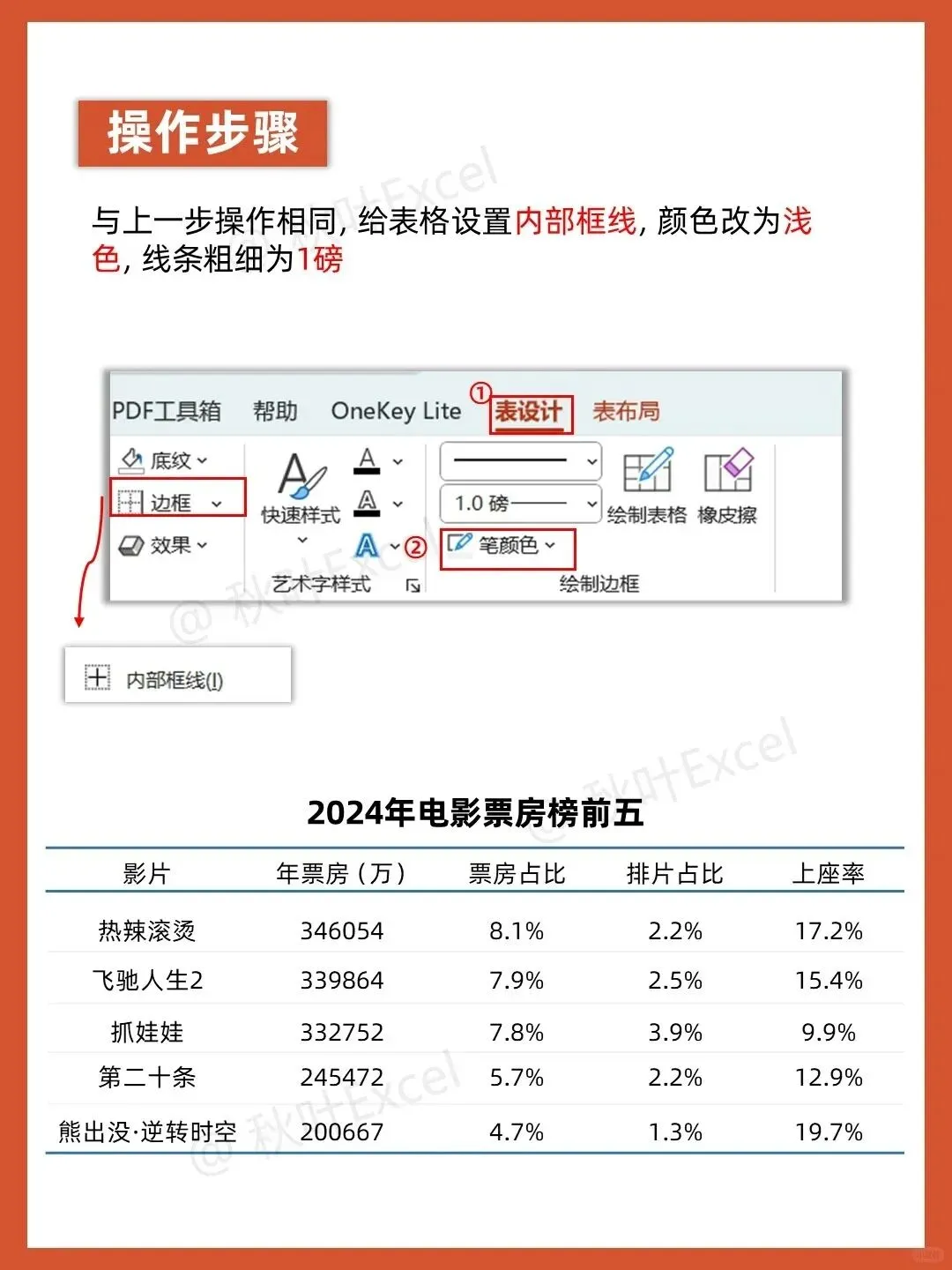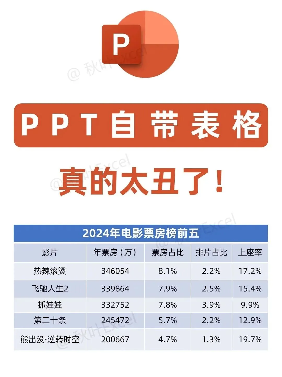 做PPT时,你是不是也习惯直接插入表格,然后看着那些灰底黑框、密密麻麻的格子发愁?默认的表格样式不仅缺乏美感,还让数据显得杂乱无章。其实,只需几个简单的设置,就能让表格瞬间变得高级又清晰。今天,我们就以一份电影票房榜为例,手把手教你用5步给表格“换脸”。
