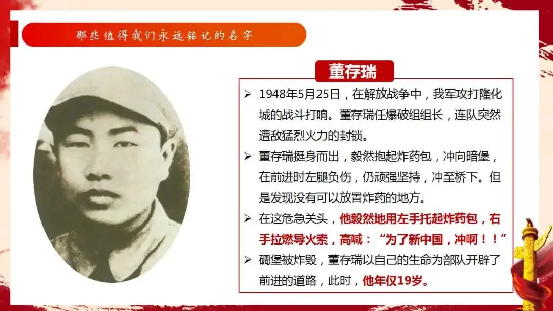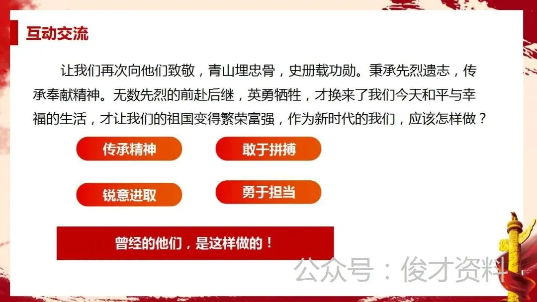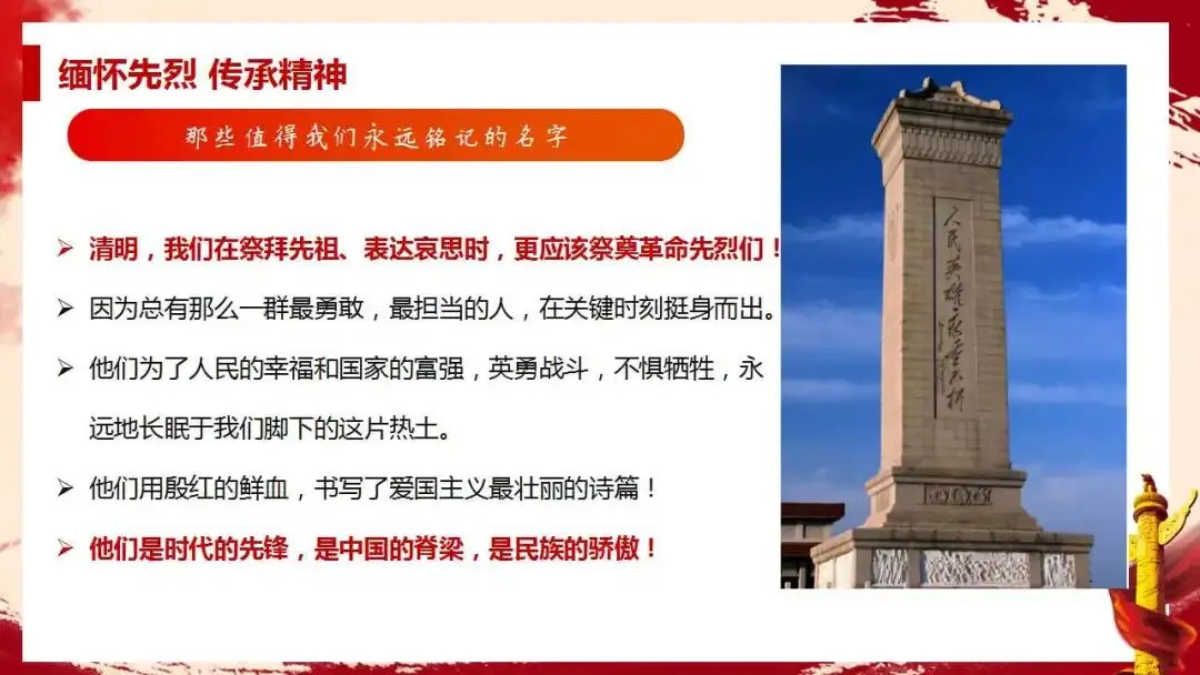 【通用】清明节主题班会ppt:缅怀英烈,不忘担当。