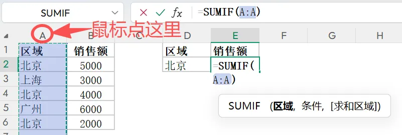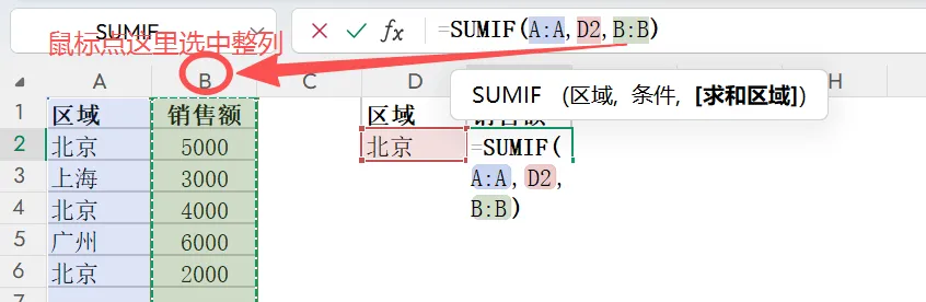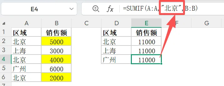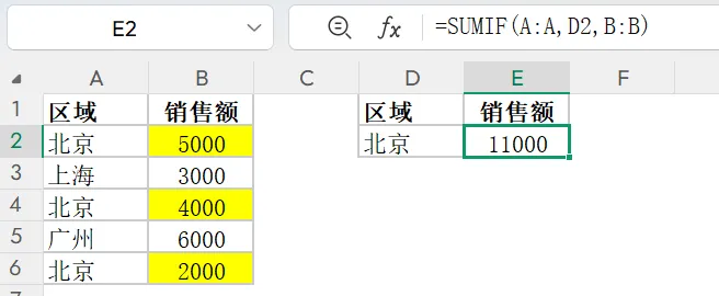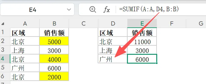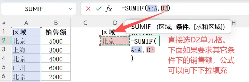 =SUMIF(条件判断区域, 筛选条件, 求和区域)