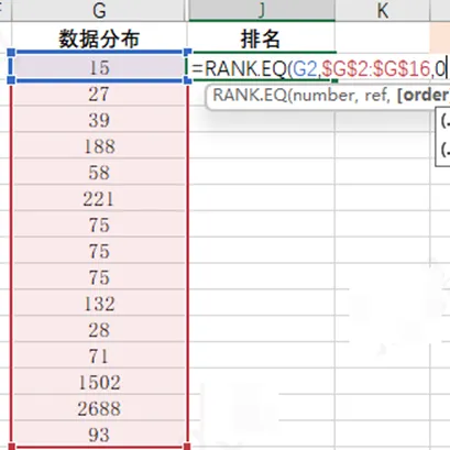 公式:=RANK.EQ(要排名的数值, 数据区域, [排序方式])